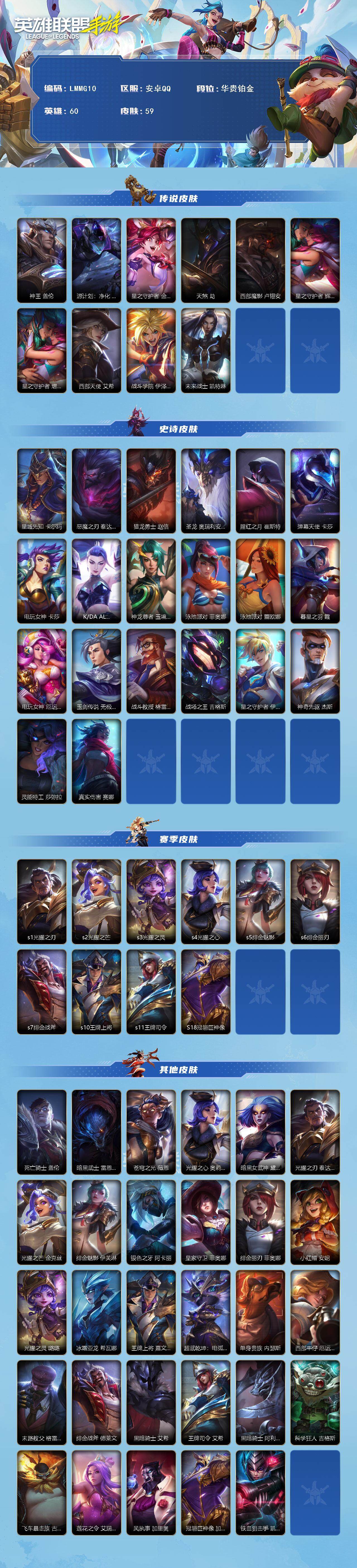 【C2534831811】【LMMG10】60英雄/59皮肤/10传说/20史诗/华贵铂金/神王盖伦/源计划: 净化/星之守护者 金克丝/天煞劫/西部魔影卢锡安/星之守护者 辉/星之守护者 熠/西部天使寒冰/战斗学院ez/未来战士 凯特琳/星域先知(可升级)/恶魔之刃/猎龙勇士赵信/圣龙/腥红之月卡牌/弹幕天使/电玩女神卡莎/K/DA ALL OUT卡莎/神龙尊者玉境灵龙/泳池派对剑姬/泳池派对蕾欧娜/暮星之羽/电玩女神女枪/玉剑传说 无极 易/战斗教授男枪/战场之王炸弹人/星之守护者EZ/神奇先驱杰斯/灵能特工莎弥拉/真实伤害赛娜/s1光耀之刃/s2光耀之芒/s3光耀之灵/s4光耀之心/s5绯金魅影/s6绯金丽刃/s7绯金战斧/s10王牌上将/s11王牌司令/S18冠翎巨神像/死亡骑士/暗黑武土狮子狗/苍穹之光薇恩/光耀之心发条/暗黑女武神皎月/光耀之刃蛮王/光耀之芒金克斯/绯金魅影 (可升级)/银色之牙/皇家守卫/绯金丽刃(可升级)/小红帽/光耀之灵/冰霜亚龙/王牌上将 嘉文四世/超武乾坤:电弧/单身贵族/西部牛仔女枪/末路教父/绯金战斧 (可升级)/黑暗骑士 艾希/王牌司令 艾希/黑暗骑士牛头/科学狂人/飞车暴走族/莲花之令刀妹/风执事/冠翎巨神像 加里奥/铁血狙击手