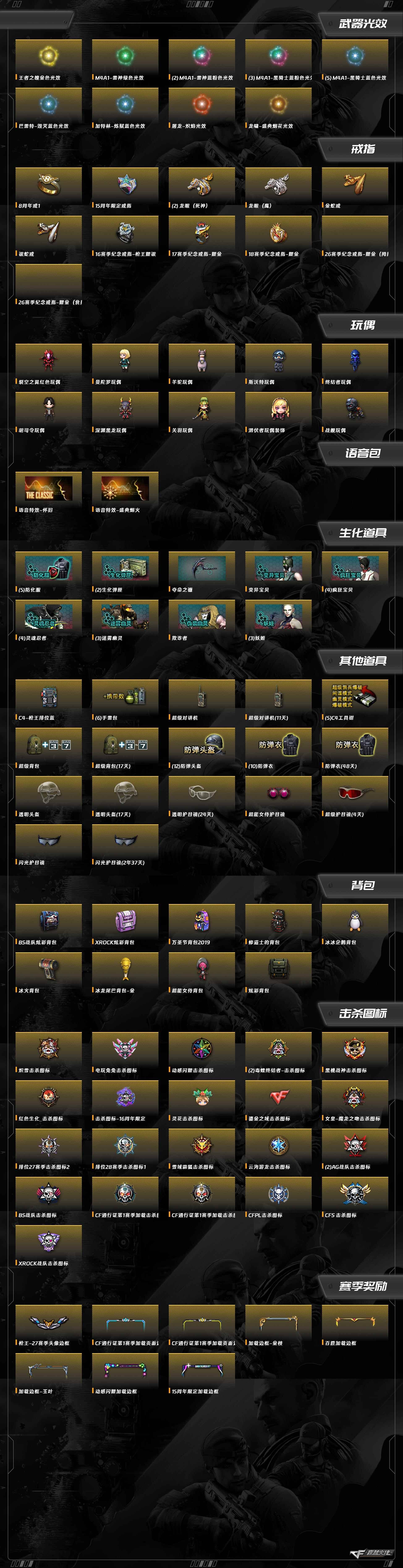 Barrett-毁灭,斩神刀-雷暴,擎天,屠龙,沙鹰-修罗,加特林-炼狱,汤姆逊-烈龙,9A91-烈火,QBZ03-金色蔷薇,AWM-裁决,Barrett-极光,白虎-电玩蓝兔,M4A1-千变,M4A1-黑龙,黑骑士-海王,M4A1-黑骑士,M4A1-雷神,AK47-B-战神,AK-47-猩红传说,AK47-B-战士,AK47-黑鲨,AK47-火麒麟