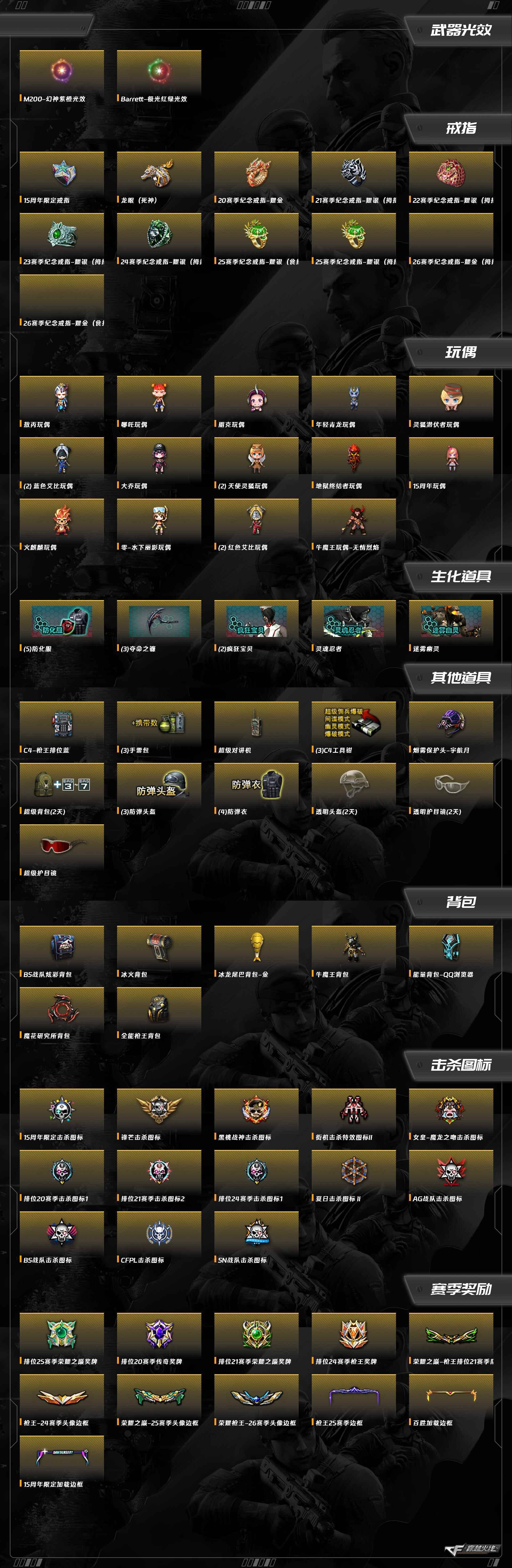 M4A1-玫瑰精灵,幻灵之锋,麒麟刺,沙鹰-天神,沙鹰-修罗,加特林-炼狱,汤姆逊-烈龙,AN94-超新星,AK12-天启,AA-12-雷霆,AWM-裁决,Barrett-极光,Barrett-毁灭,M200-幻神,M4A1-青龙,M4A1-武圣,M4A1-龙血,M4A1-黑龙,M4A1-死神,M4A1-雷神,AK47-机械迷城,AK47-黑鲨,AK47-火麒麟,Kar98k-星神,龙啸-烈火龙威