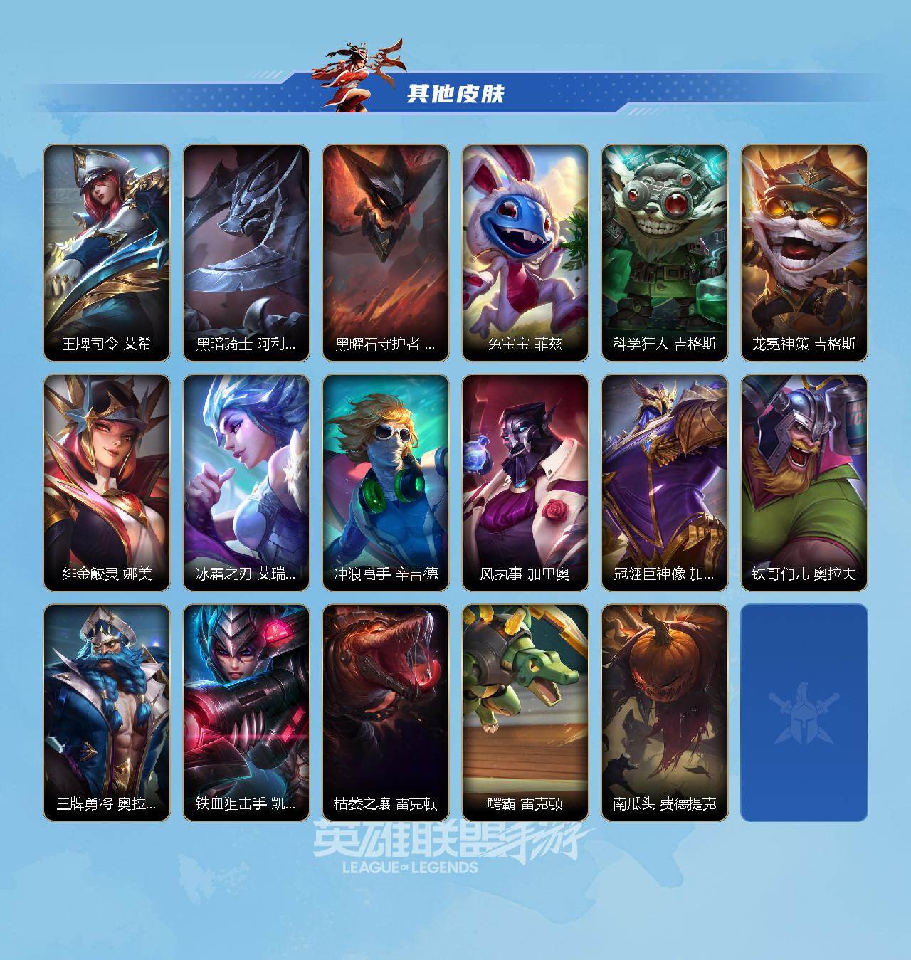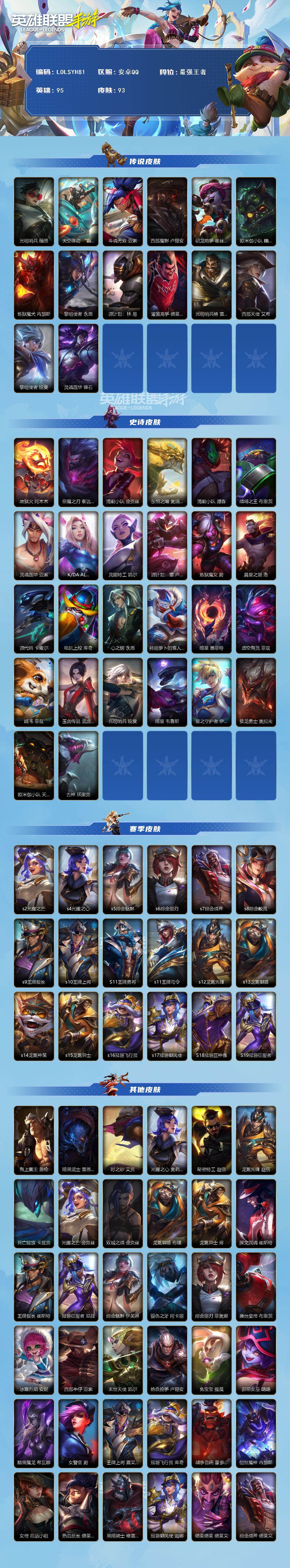 【C26323367】【LOLSYH81】95英雄/93皮肤/14传说/最强王者/光明哨兵薇恩/太空律动 “猫猫”布里和里茨 布里茨/斗魂无双 亚索/西部魔影卢锡安/驯龙炮手/欧米伽小队 幽灵特工/炼狱魔犬/黎明使者 永恩/源计划:林 易/灌篮高手/光明哨兵格雷福斯/西部天使寒冰/黎明使者瑞文/灵魂莲华锤石/地狱火阿木木/恶魔之刃/清剿小队金克斯/东恒之曜 奥瑞利安·索尔/清剿小队潘森/战场之王机器人/灵魂莲华亚索/K/DA ALL OUT阿狸/灵能特工天使/源计划: 雷/炼狱魔女/晨星之翎/源代码青钢影/电玩上校/心之钢 永恩/持胡萝卜的雪人/暗星 墨菲特/虚空海灵/绒毛/玉剑传说 武剑仙/光明哨兵锐雯/暗星维鲁斯/星之守护者EZ/猎龙勇士奥拉夫/欧米伽小队 天雷爆破手 维迦/古神狼人/s2光耀之芒/s4光耀之心/s5绯金魅影/s6绯金丽刃/s7绯金战斧/s8绯金皎灵/s9王牌舰长/s10王牌上将/S11王牌勇将/s11王牌司令/s12龙冕先锋/s13龙冕御盾/s14龙冕神策/s15龙冕异士/s16冠翎飞行员/s17冠翎御风使/S18冠翎巨神像/S19冠翎征服者/海上霸主/暗黑武土狮子狗/时之砂/光耀之心发条/秘密特工/龙冕先锋 赵信/死亡绽放/光耀之芒金克斯/双城之战金克斯/龙冕御盾 布隆/龙冕异士 烬/探戈灵魂崔斯特/王牌舰长/冠翎征服者 尼菈/绯金魅影 (可升级)/银色之牙/绯金丽刃(可升级)/擂台皇帝/冰霜烈焰/西部牛仔亚索/末世天使/绝命抢手/免宝宝提莫/邪恶女巫/黯黑魔龙龙女/女警官/王牌上将 嘉文四世/冠翎飞行员 库奇/战争血统/创世魔神/女帝/热血班长/黑暗骑士男枪/冠翎御风使 迦娜/德莱德莱/绯金战斧 (可升级)/王牌司令 艾希/黑暗骑士牛头/黑曜石守护者/免宝宝菲兹/科学狂人/龙冕神策 吉格斯/绯金鲛灵(可升级)/冰霜之刀/冲浪高手/风执事/冠翎巨神像 加里奥/铁哥们儿奥拉夫/王牌勇将 奥拉夫/铁血狙击手/枯萎之壤/鳄霸/南瓜头 费德提克