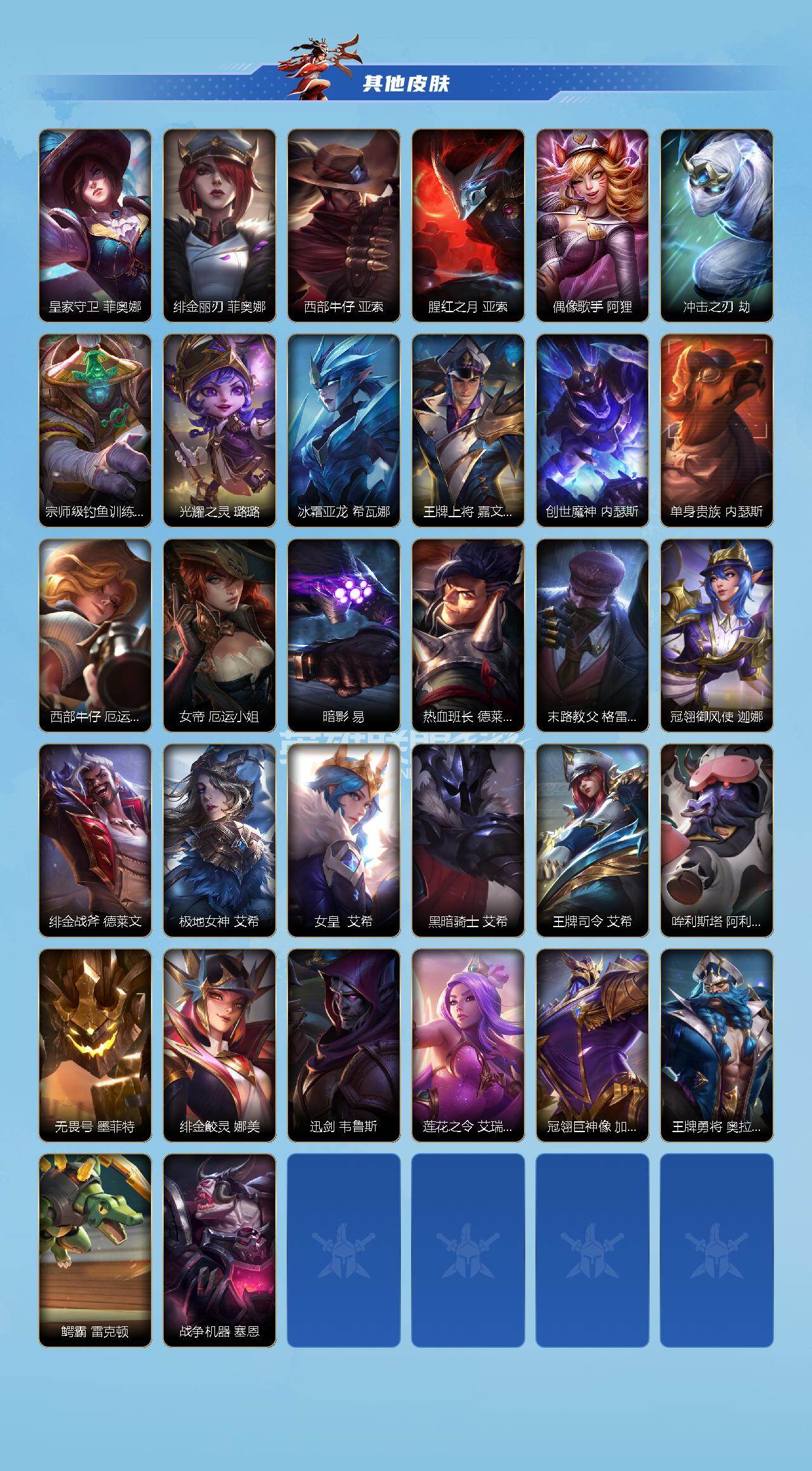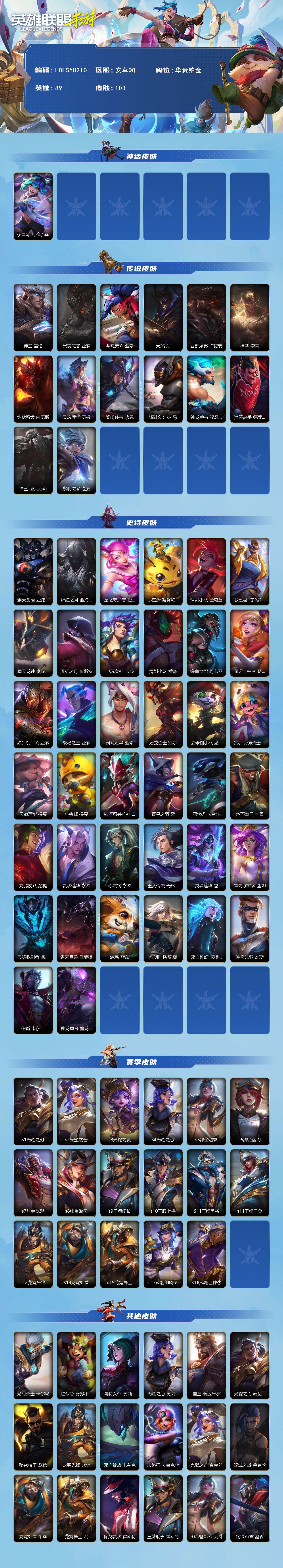 【C263014016】【LOLSYH210】89英雄/103皮肤/华贵铂金/夜星流火 金克丝/神王盖伦/黑夜使者亚索/斗魂无双 亚索/天煞劫/西部魔影卢锡安/神拳盲僧/炼狱魔犬/灵魂莲华 瑟提/黎明使者 永恩/源计划:林 易/神龙尊者 驭风啸龙/灌篮高手/神王诺手/黎明使者瑞文/霸天剑魔 亚托克斯/腥红之月剑魔/星之守护者拉克丝/小蜜蜂 努努和威朗普/清剿小队金克斯/礼物选好了吗? 布隆/霸天龙神龙王/腥红之月卡牌/电玩女神卡莎/清剿小队潘森/铁血女忍/星之守护者萨勒芬妮/源计划:风/战场之王亚索/灵魂莲华亚索/屠龙勇士 凯尔/欧米伽小队 魔鬼伞兵/我,羽饰骑士 崔丝塔娜/灵魂莲华提莫/小蜜蜂 提莫/银河魔装机神龙女/暮星之羽/源代码青钢影/地下拳王/龙腾虎跃腕豪/灵魂莲华永恩/心之钢 永恩/玉剑传说 无极 易/灵魂莲华 易/星之守护者风女/灵魂收割者 德莱文/霸天巨兽石头人/绒毛/光明哨兵锐雯/死亡善约卡特/神奇先驱杰斯/伯爵 卡萨丁/神龙尊者 魔龙/s1光耀之刃/s2光耀之芒/s3光耀之灵/s4光耀之心/s5绯金魅影/s6绯金丽刃/s7绯金战斧/s8绯金皎灵/s9王牌舰长/s10王牌上将/S11王牌勇将/s11王牌司令/s12龙冕先锋/s13龙冕御盾/s15龙冕异士/s17冠翎御风使/S18冠翎巨神像/光明骑士卡尔玛/脏兮兮/哥特女仆/光耀之心发条/国王/光耀之刃蛮王/秘密特工/龙冕先锋 赵信/死亡绽放/末路狂花/光耀之芒金克斯/双城之战金克斯/龙冕御盾 布隆/龙冕异士 烬/探戈灵魂崔斯特/王牌舰长/绯金魅影 (可升级)/钢铁意志/皇家守卫/绯金丽刃(可升级)/西部牛仔亚索/腥红之月亚索/偶像歌手/冲击之刃劫/宗师级钓鱼训练师/光耀之灵/冰霜亚龙/王牌上将 嘉文四世/创世魔神/单身贵族/西部牛仔女枪/女帝/暗影/热血班长/末路教父/冠翎御风使 迦娜/绯金战斧 (可升级)/极地女神/女皇/黑暗骑士 艾希/王牌司令 艾希/哞利斯塔/无畏号/绯金鲛灵(可升级)/迅剑/莲花之令刀妹/冠翎巨神像 加里奥/王牌勇将 奥拉夫/鳄霸/战争机器