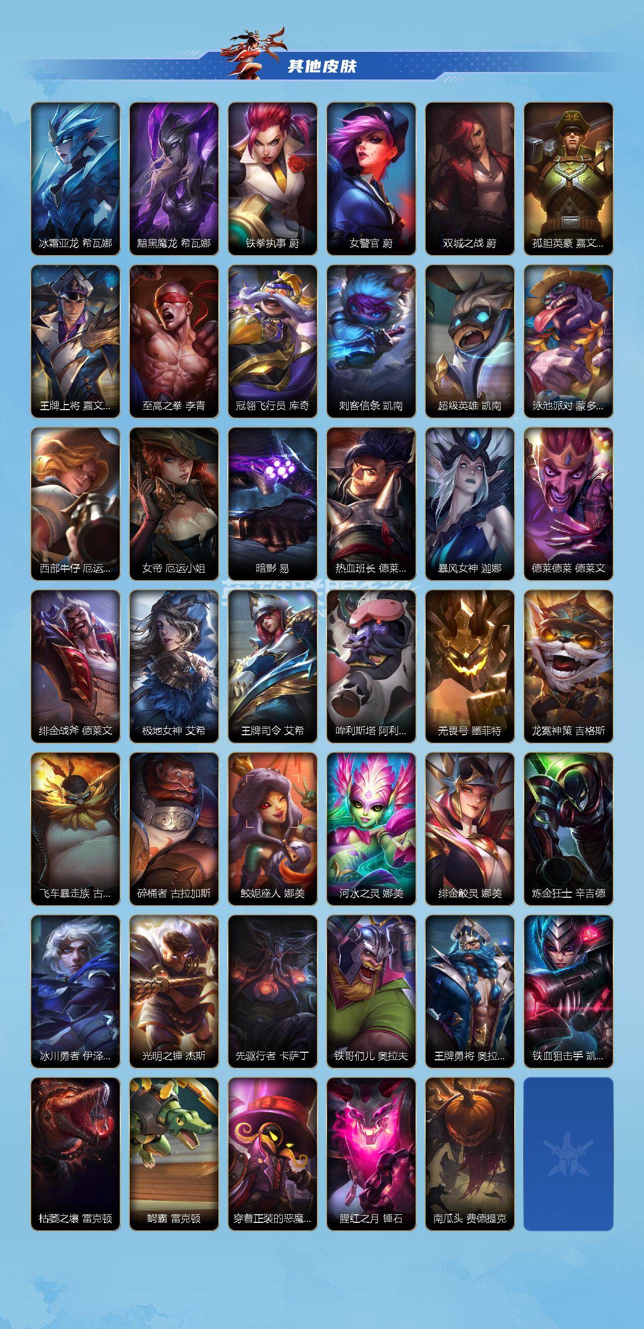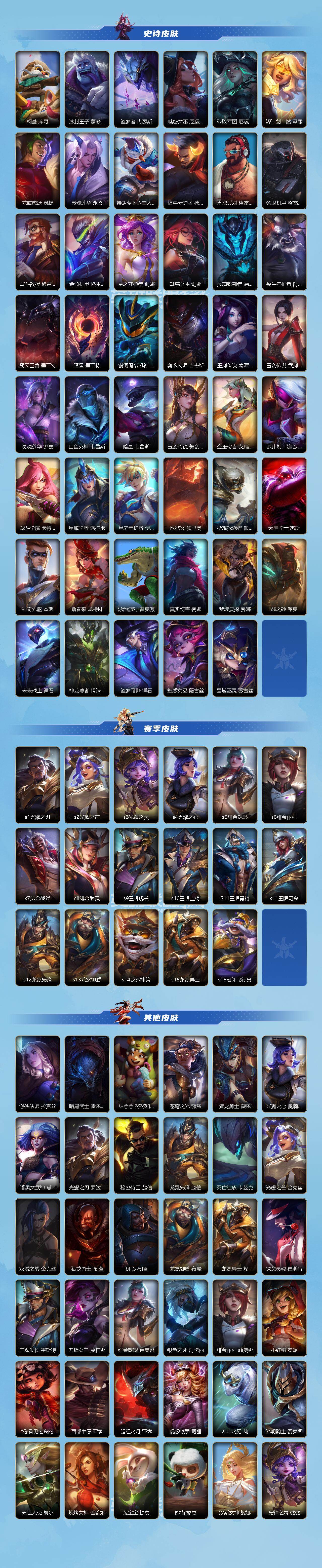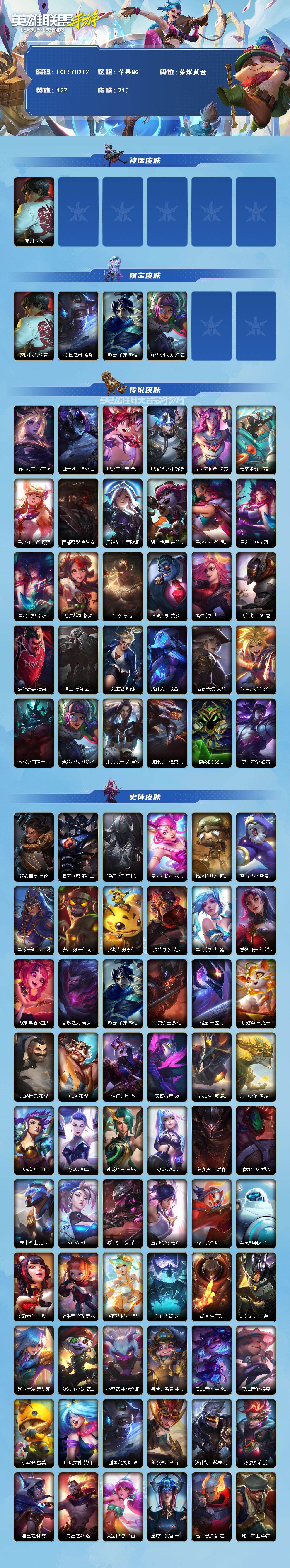 【C263060000】【LOLSYH212】122英雄/215皮肤/1神话/30传说/荣耀黄金/龙的传人盲僧/创星之灵/赵云子龙/涂鸦小队莎弥拉/暗星女王拉克丝/源计划: 净化/星之守护者 金克丝/星域游侠卡牌/星之守护者 卡莎/太空律动 “猫猫”布里和里茨 布里茨/星之守护者阿狸/西部魔影卢锡安/月蚀骑士蕾欧娜/驯龙炮手/星之守护者 辉/星之守护者 落/星之守护者 陨/剪胜裁春格温/神拳盲僧/律政大亨/福牛守护者女枪/源计划:林 易/灌篮高手/神王诺手/女主播风女/源计划: 联合/西部天使寒冰/战斗学院ez/地狱之门卫士/未来战士 凯特琳/源计划:泯灭 雷克顿/最终BOSS维迦/灵魂莲华锤石/钢铁军团/霸天剑魔 亚托克斯/腥红之月剑魔/星之守护者拉克丝/殇之机器人/雷喵喵尔/星域先知(可升级)/丧尸 努努和威朗普/小蜜蜂 努努和威朗普/探梦奇旅 艾克/星之守护者发条/烈焰仙子皎月/焕影迎春佐伊/恶魔之刃/猎龙勇士赵信/暗星螳螂/烘焙童谣 悠米/末路管家/猛虎布隆/腥红之月烬/灭迹行者 烬/霸天龙神龙王/东恒之曜 奥瑞利安·索尔/电玩女神卡莎/K/DA ALL OUT卡莎/神龙尊者玉境灵龙/K/DA ALL OUT寡妇/猎龙勇士潘森/清剿小队潘森/未来战士潘森/K/DA ALL OUT阿卡丽/源计划: 火/玉剑传说 无双 菲奥娜/福牛守护者剑姬/苹果机器人/悦鼓春生萨勒芬妮/福牛守护者安妮/幻梦甜心 阿狸/死亡哲约劫/武神/源计划: 山/战斗学院蕾欧娜/欧米伽小队 魔鬼伞兵/小恶魔/娜就去看看/灵魂莲华 崔丝塔娜/灵魂莲华提莫/小蜜蜂 提莫/电玩女神琴女/秘旅探索者龙女/源计划: 裁决/燎原烈焰蔚/暮星之羽/晨星之翎/太空律动“百万调音”/星域审判官/福牛守护者皇子/地下拳王/柯基/冰封王子/盗梦者/魅惑女巫女枪/破败军团女枪/源计划: 燃/龙腾虎跃腕豪/灵魂莲华永恩/持胡萝卜的雪人/福牛守护者诺手/泳池派对男枪/禁卫机甲/战斗教授男枪/绝命机甲男枪/星之守护者风女/魅惑女巫风女/灵魂收割者 德莱文/福牛守护者牛头/霸天巨兽石头人/暗星 墨菲特/银河魔装机神小鱼人/奥术大师吉格斯/玉剑传说 寒潭夭夭/玉剑传说 武剑仙/灵魂莲华 锐雯/白色死神维鲁斯/暗星维鲁斯/玉剑传说 舞剑仙 艾瑞莉娅/金玉贺吉 艾瑞莉娅/源计划: 雄心/战斗学院卡特/星域学者/星之守护者EZ/地狱火加里奥/秘旅探索者加里奥/天启骑士/神奇先驱杰斯/踏春来女警/泳池派对鳄鱼/真实伤害赛娜/梦境灵探赛娜/怨之砂/未来战士锤石/神龙尊者 钢铁之龙 锤石/盗梦暗影 锤石/魅惑女巫薇古丝/星域巫灵 薇古丝/s1光耀之刃/s2光耀之芒/s3光耀之灵/s4光耀之心/s5绯金魅影/s6绯金丽刃/s7绯金战斧/s8绯金皎灵/s9王牌舰长/s10王牌上将/S11王牌勇将/s11王牌司令/s12龙冕先锋/s13龙冕御盾/s14龙冕神策/s15龙冕异士/s16冠翎飞行员/游侠法师/暗黑武土狮子狗/脏兮兮/苍穹之光薇恩/猎龙勇士薇恩/光耀之心发条/暗黑女武神皎月/光耀之刃蛮王/秘密特工/龙冕先锋 赵信/死亡绽放/光耀之芒金克斯/双城之战金克斯/猎龙勇士布隆/狮心 布隆/龙冕御盾 布隆/龙冕异士 烬/探戈灵魂崔斯特/王牌舰长/刀锋女王/绯金魅影 (可升级)/银色之牙/绯金丽刃(可升级)/小红帽/“你看见过我的熊猫吗?” 安妮/西部牛仔亚索/腥红之月亚索/偶像歌手/冲击之刃劫/光明骑士贾克斯/末世天使/烧烤女神/免宝宝提莫/熊猫/缪斯女神/光耀之灵/冰霜亚龙/黯黑魔龙龙女/铁拳执事/女警官/双城之战蔚/孤胆英豪/王牌上将 嘉文四世/至高之拳/冠翎飞行员 库奇/刺客信条/超级英雄/泳池派对蒙多/西部牛仔女枪/女帝/暗影/热血班长/暴风女神/德莱德莱/绯金战斧 (可升级)/极地女神/王牌司令 艾希/哞利斯塔/无畏号/龙冕神策 吉格斯/飞车暴走族/碎桶者/鲛妮座人 娜美/河水之灵/绯金鲛灵(可升级)/炼金狂士/冰川勇者/光明之锤杰斯/先驱行者/铁哥们儿奥拉夫/王牌勇将 奥拉夫/铁血狙击手/枯萎之壤/鳄霸/穿着正装的恶魔/腥红之月锤石/南瓜头 费德提克
