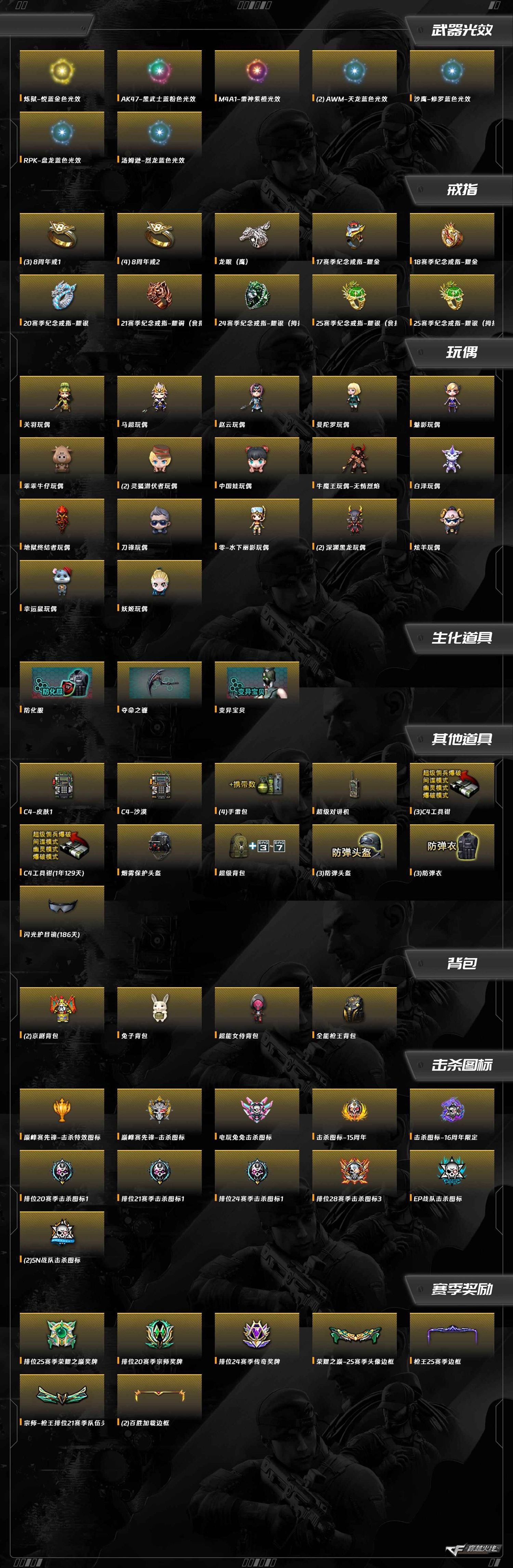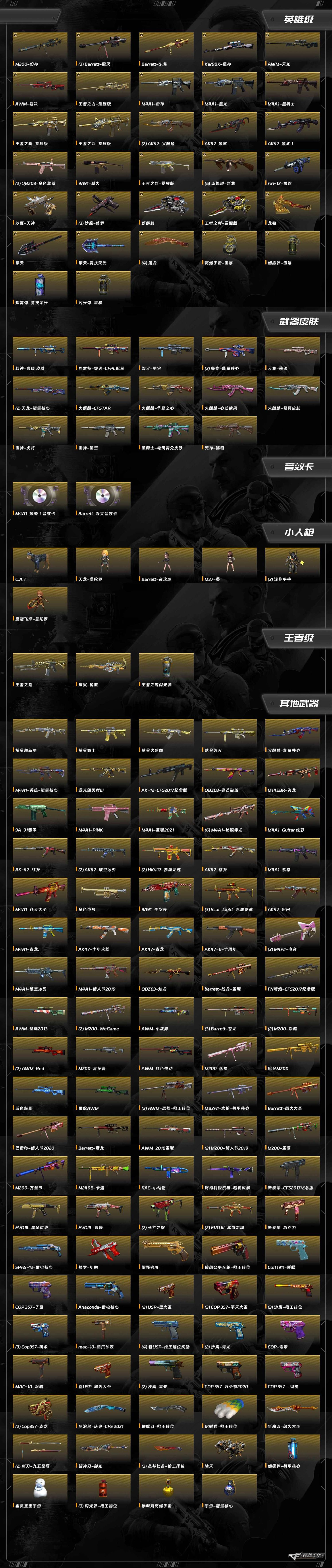 AWM-裁决,擎天,麒麟刺,龙啸,屠龙,沙鹰-天神,擎天-竞技荣光,沙鹰-修罗,汤姆逊-烈龙,9A91-烈火,QBZ03-金色蔷薇,AA-12-雷霆,M200-幻神,AWM-天龙,Barrett-朱雀,Barrett-毁灭,M4A1-黑龙,M4A1-黑骑士,M4A1-雷神,AK47-黑武士,AK47-黑鲨,AK47-火麒麟,Kar98k-星神