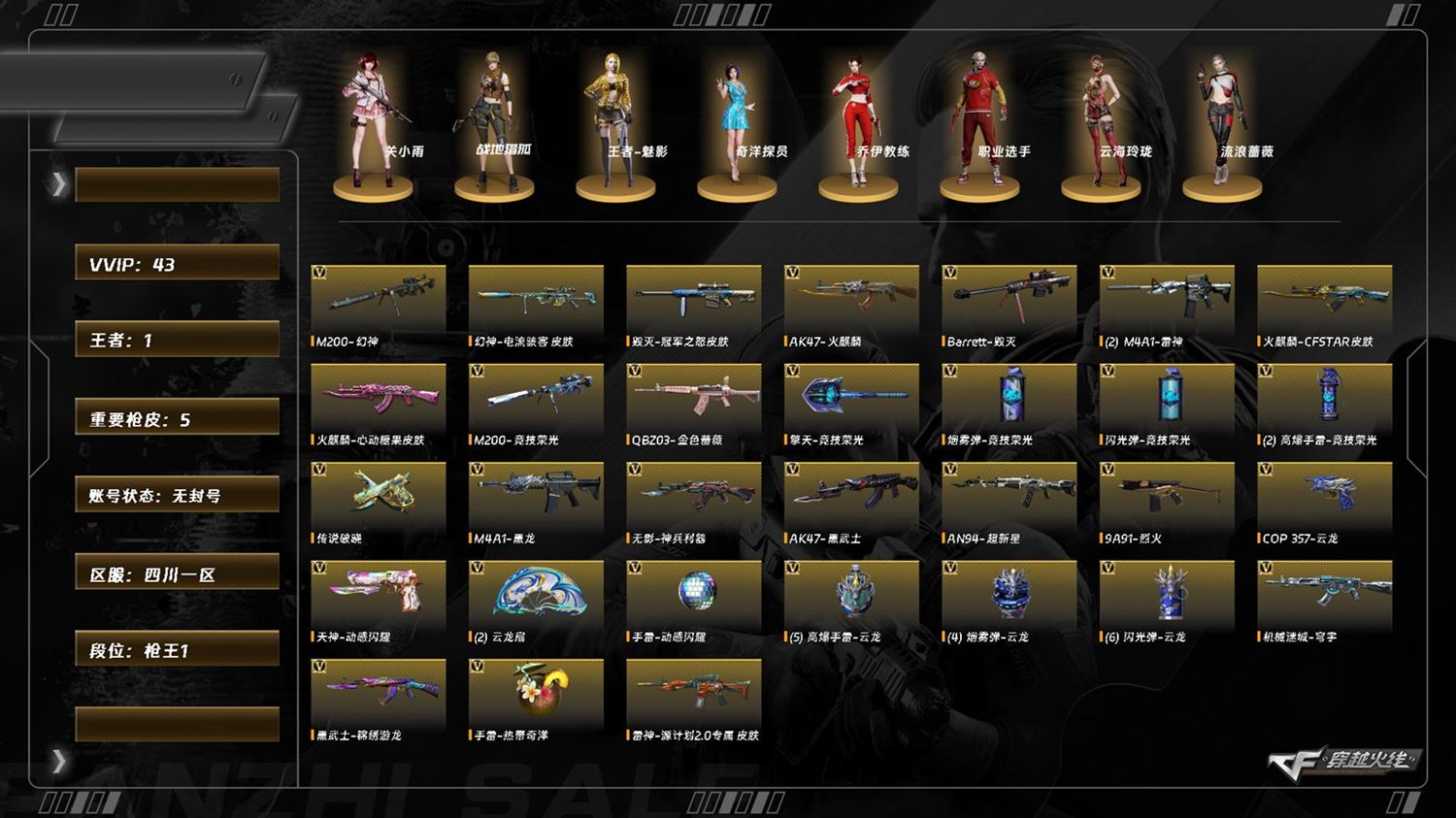 【C263371863】[16377796]LC7862/西部/四川一区/可排位/42V/传说破晓/幻神/幻神电流骇客/LC200竞技荣光/QBZ金色蔷薇/COP云龙/【四防角色/王者魅影/】/【角色】/关小雨/零纪元/战地猎狐/奇洋探员/乔伊教练/云海玲珑/【音效卡/碧霄极光音效卡/昌龙怀旧音效卡/】/【枪皮】/雷神源计划/火麒麟心动糖果/毁灭冠军之怒/【小人枪/LCK5炽火炎龙/KAC锯式机枪黑桃战神/】/永久AC/找回包赔