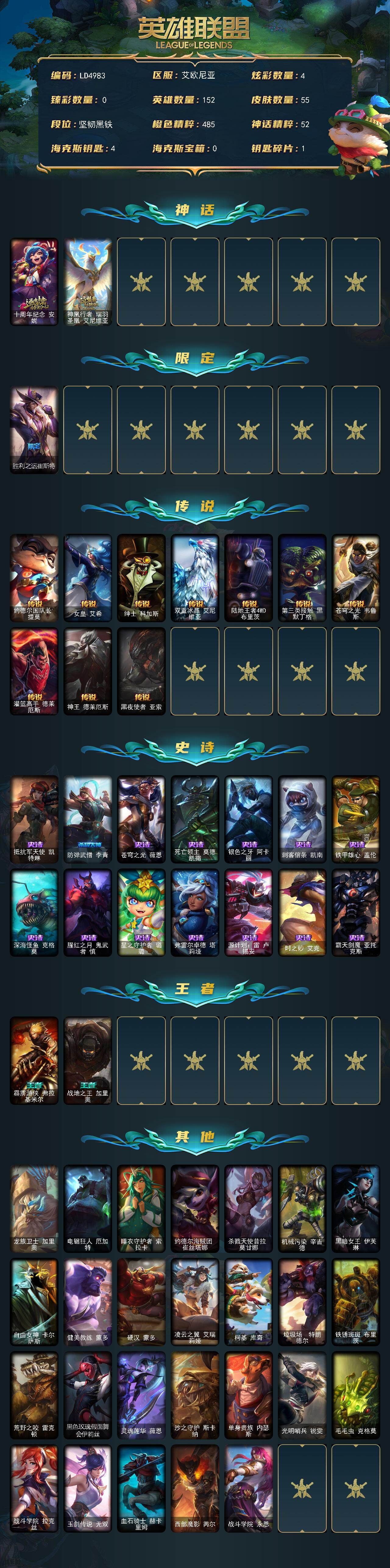 【C263419183】【LD4983】152英雄/55皮肤/2神话/1限定/4炫彩/10传说/14史诗/未定级/十周年纪念安妮/神凰行者瑞羽圣凰艾尼维亚/胜利之运崔斯特/约德尔国队长提莫/女皇艾希/绅士科加斯/双重冰晶艾尼维亚/陆地王者4WD布里茨/第三类接触黑默丁格/苍穹之光韦鲁斯/灌篮高手德莱厄斯/神王德莱厄斯/黑夜使者亚索/抵抗军天使凯特琳/防弹武僧李青/苍穹之光薇恩/死亡领主莫德凯撒/银色之牙阿卡丽/刺客信条凯南/铁甲雄心盖伦/深海怪鱼克格莫/腥红之月鬼武者慎/星之守护者璐璐/弗雷尔卓德塔莉垭/源计划雷卢锡安/时之砂艾克/霸天剑魔亚托克斯/霹雳游侠弗拉基米尔/战地之王加里奥/龙族卫士加里奥/电锯狂人厄加特/睡衣守护者索拉卡/约德尔海贼团崔丝塔娜/杀戮天使昔拉莫甘娜/机械污染辛吉德/黑暗女王伊芙琳/自由女神卡尔萨斯/健美教练蒙多/硬汉蒙多/凌云之翼艾瑞莉娅/柯基库奇/垃圾场特朗德尔/铁锈斑斑布里茨/荒野之咬雷克顿/黑色玫瑰假面舞会伊莉丝/灵魂莲华薇恩/沙之守护斯卡纳/单身贵族内瑟斯/光明哨兵锐雯/毛毛虫克格莫/战斗学院拉克丝/玉剑传说无双/血石骑士赫卡里姆/西部魔影芮尔/战斗学院永恩