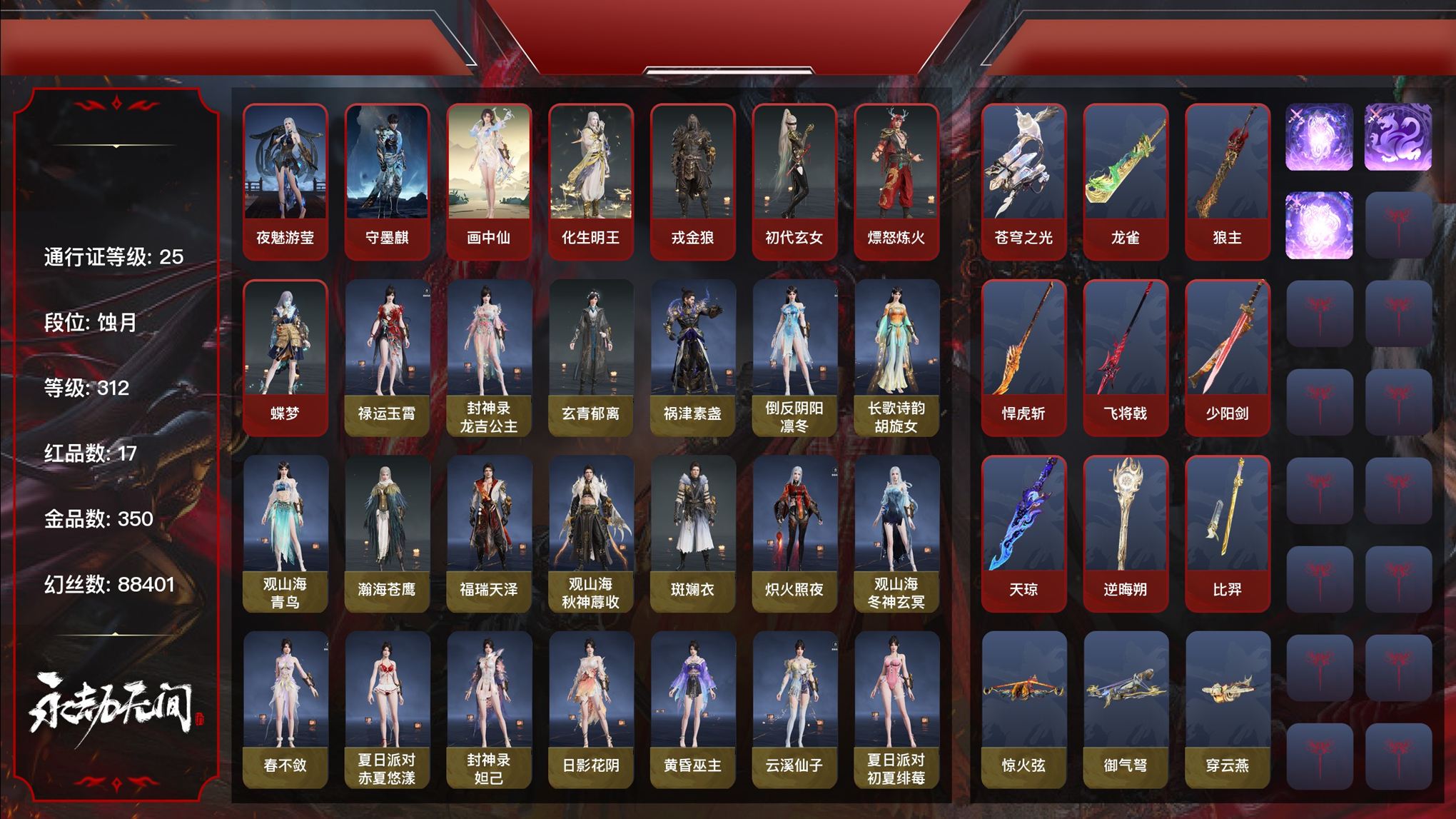 【C266219007】[17307364]WJ5123,steam端游,可换绑,17红350金,等级312,收藏值258229,三人段位蚀月4,幻丝88401,金砖18,通行证Lv.25,声望7,变身器,绿野守护竹韵悠,荆魂,红色神品,夜魅游莹,守墨麒,画中仙,化生明王,戎金狼,初代玄女,熛怒炼火,蝶梦,苍穹之光,龙雀,狼主,悍虎斩,飞将戟,少阳剑,天琼,逆晦朔,比羿,角色金色皮肤,禄运玉霄,龙吉公主,玄青郁离,祸津素盏,凛冬,胡旋女,青鸟,瀚海苍鹰,福瑞天泽,秋神蓐收,斑斓衣,炽火照夜,观山海冬神玄冥,春不敛,赤夏悠漾,妲己,日影花阴,黄昏巫主,云溪仙子,初夏绯莓,绮云衫,腓腓,云中君,文鳐,猫,金财聚辉,日月明,暖冬茶馨,雪铃绮歌,过江龙,麒麟牙,护云狩,数珠丸,
