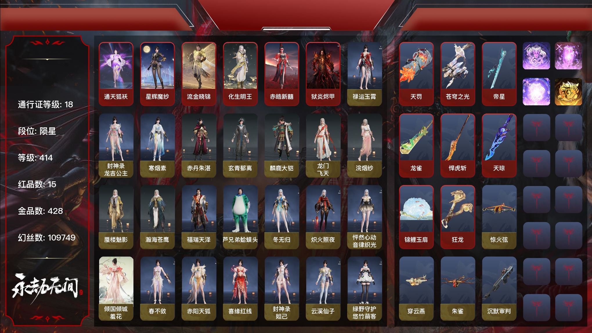 【C266229111】[17320725]WJ5136,网易手机,可换绑,三人段位陨星1,声望1,15红,428金,等级414,收藏值290010,幻丝109749,金砖146,通行证Lv18,变身器,夜蔷薇,红色神品,墨离,通天狐袄,星辉魔纱,流金晓锦,化生明王,赤皓新囍,狱炎烬甲,天罚,苍穹之光,帝星,龙雀,悍虎斩,天琼,锦鲤玉扇,狂龙,角色金色皮肤,禄运玉霄,封神录龙吉公主,寒烟素,赤丹朱湛,玄青郁离,麟鹿大铠,龙门飞天,浣烟纱,蜃楼魅影,瀚海苍鹰,福瑞天泽,冬无归,炽火照夜,音律织光,倾羞花,春不敛,赤阳天狐,喜缘红线,妲己,云溪仙子,悠竹萌客,涂鸦少女,卷王,念奴娇,寿竹云春,赤诚心,姜子牙,云间影,山漠狞影,日月明,雪铃绮歌,白熊,九骊之君,鹅黄纱梦,过江龙,白鹿,斩银河,塑梦钥匙,活动中心手机绑定无法解绑,