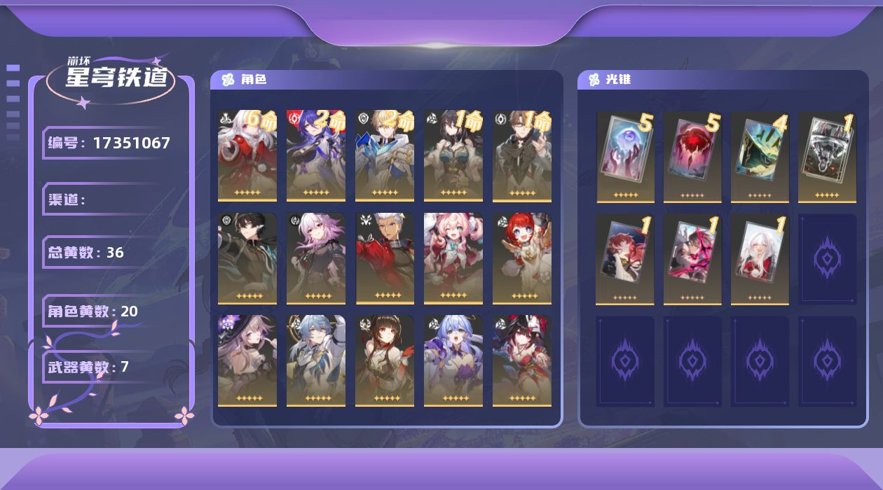 【C267970495】[17813241]0ALYB5总黄数36角色数量17武器数量7冒险等级 【满命5星角色1个】6命克拉拉, 【二命5星角色2个】2命黄泉,2命杰帕德, 【一命5星角色2个】1命阮•梅,1命瓦尔特, 【5星角色12个】0命缇宝,0命大黑塔,0命星期日,0命灵砂,0命知更鸟,0命花火,0命真理医生,0命符玄,0命彦卿,0命姬子,0命布洛妮娅,0命Archer, 【5精武器2个】精5精5记忆永不落幕,精5精5记一位星神的陨落, 【4精武器1个】精4精4星海巡航, 【1精武器4个】精1行于流逝的岸,精1无可取代的东西,精1以世界之名,精1银河铁道之夜, "