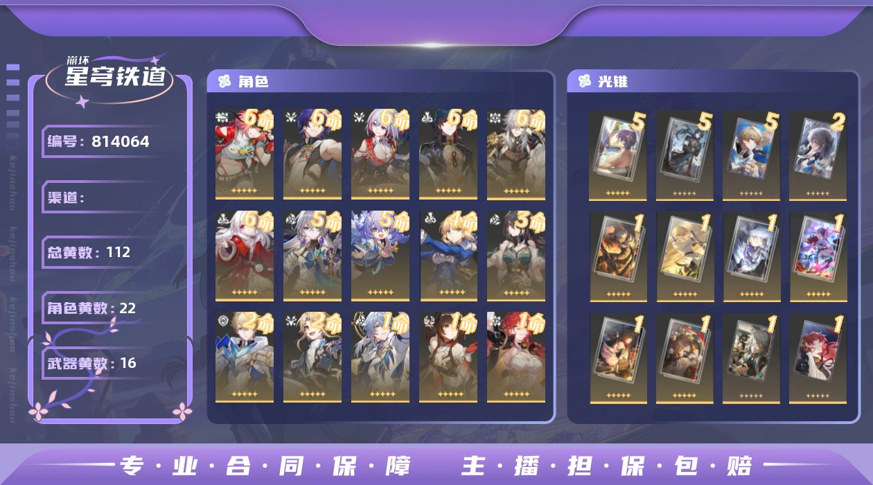 【C267904816】[17837188]0AQGK2总黄数112角色数量21武器数量13冒险等级 【满命5星角色6个】6命乱破,6命真理医生,6命托帕&账账,6命景元,6命克拉拉,6命刃, 【五命5星角色2个】5命白露,5命布洛妮娅, 【四命5星角色1个】4命Saber, 【三命5星角色1个】3命阮•梅, 【二命5星角色2个】2命彦卿,2命杰帕德, 【一命5星角色3个】1命星期日,1命灵砂,1命姬子, 【5星角色6个】0命忘归人,0命黑天鹅,0命藿藿,0命符玄,0命瓦尔特,0命Archer, 【5精武器3个】精5精5纯粹思维的洗礼,精5精5到不了的彼岸,精5精5制胜的瞬间, 【2精武器】精2精2但战斗还未结束, 【1精武器9个】精1回到大地的飞行,精1忍法帖•缭乱破魔,精1唯有香如故,精1无可取代的东西,精1镜中故我,精1拂晓之前,精1以世界之名,精1银河铁道之夜,精1如泥酣眠, "