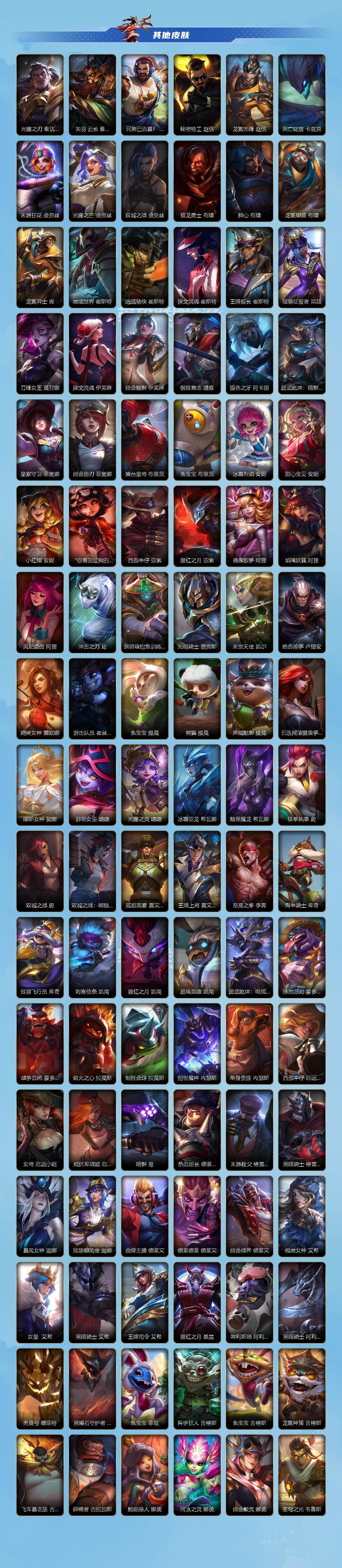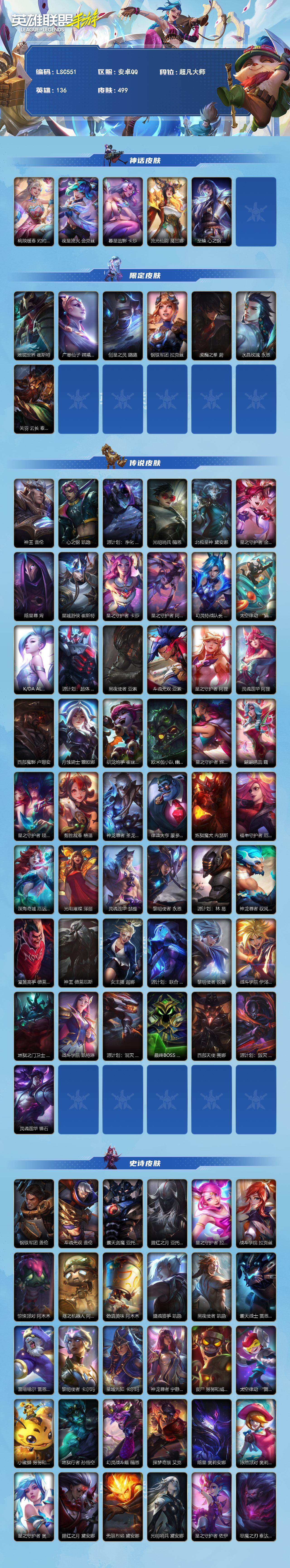 【C267974321】【LSC551】136英雄/499皮肤/5神话/49传说/294史诗/超凡大师/桃映暖春 灼灼芳菲 拉克丝/夜星流火 金克丝/暮星追影 卡莎/流光仙韵 莫甘娜/至臻 心之钢 永恩/地底世界 崔斯特/广寒仙子嫦娥/创星之灵/钢铁军团拉克丝/虎痴之拳/水晶玫瑰永恩/关羽云长/神王盖伦/心之钢 凯隐/源计划: 净化/光明哨兵薇恩/北极星神 黛安娜/星之守护者 金克丝/暗星尊/星域游侠卡牌/星之守护者 卡莎/星之守护者 阿卡丽/幻灵特战队长 菲奥娜/太空律动 “猫猫”布里和里茨 布里茨/K/DA ALLOUT萨勒芬妮/源计划:超体 莫德凯撒/黑夜使者亚索/斗魂无双 亚索/星之守护者阿狸/灵魂莲华 阿狸/西部魔影卢锡安/月蚀骑士蕾欧娜/驯龙炮手/欧米伽小队 幽灵特工/星之守护者 辉/翩翩绣蕊 霞/星之守护者 陨/剪胜裁春格温/神龙尊者 圣龙 李青/律政大亨/炼狱魔犬/福牛守护者女枪/深海奇域 厄运小姐/光电璀璨 泽丽/灵魂莲华 瑟提/黎明使者 永恩/源计划:林 易/神龙尊者 驭风啸龙/灌篮高手/神王诺手/女主播风女/源计划: 联合/黎明使者瑞文/战斗学院ez/地狱之门卫士/战斗学院 凯特琳/源计划:泯灭 雷克顿/最终BOSS维迦/西部天使赛娜/源计划:毁灭 派克/灵魂莲华锤石/钢铁军团/斗魂无双 盖伦/霸天剑魔 亚托克斯/腥红之月剑魔/星之守护者拉克丝/战斗学院拉克丝/惊悚派对/殇之机器人/劲道美味 阿木木/摄魂猎手凯隐/黑夜使者 凯隐/霸天战士狮子狗/雷喵喵尔/黎明使者卡尔玛/星域先知(可升级)/神龙尊者 宁静之龙 卡尔玛/丧尸 努努和威朗普/太空律动 “舞林双子” 努努和威朗普/小蜜蜂 努努和威朗普/地狱行者猴子/幻灵战斗蝠 薇恩/探梦奇旅 艾克/暗星发条/泳池派对发条/星之守护者发条/腥红之月皎月/无限烈焰/光明哨兵戴安娜/星之守护者 佐伊/恶魔之刃/黑夜使者 泰达米尔/端劲墨印 泰达米尔/猎龙勇士赵信/猛虎下山/斗魂无双 赵信/霸天异形螳螂/暗星螳螂/猎梦吞噬者 卡兹克/清剿小队金克斯/喵喵魅影金克丝/双城之战:天资 金克丝/西部魔影 赫卡里姆/蕊雪盈春:晏安 赫卡里姆/战斗校长猫咪/烘焙童谣 悠米/水晶玫瑰 悠米/末路管家/猛虎布隆/圣诞老人/礼物选好了吗? 布隆/源计划: 升华/西部牛仔/腥红之月烬/灭迹行者 烬/斗魂觉醒 烬/霸天龙神龙王/灰烬领主/圣龙/东恒之曜 奥瑞利安·索尔/灵魂莲华 辛德拉/腥红之月卡牌/未来战士卡牌/怪诞童话 崔斯特/弹幕天使/电玩女神卡莎/神龙尊者玉境灵龙/斗魂无双 尼菈/魅惑女巫 莫甘娜/玉剑传说 苍鸾 莫甘娜/K/DA ALL OUT寡妇/猎龙勇士潘森/清剿小队潘森/未来战士潘森/铁血女忍/K/DA ALL OUT阿卡丽/源计划: 暗影/源计划: 火/泳池派对剑姬/玉剑传说 无双 菲奥娜/未来战士 菲奥娜/福牛守护者剑姬/苹果机器人/战场之王机器人/星之守护者萨勒芬妮/海之歌萨勒芬妮/古神 莫德凯撒/银河魔装机神安妮/福牛守护者安妮/北极星使者 安妮/源计划:风/战场之王亚索/灵魂莲华亚索/碧空垂钓 亚索/电玩女神阿狸/K/DA ALL OUT阿狸/幻梦甜心 阿狸/源计划: 阴/死亡哲约劫/灵能特工劫/武神/灵能特工天使/屠龙勇士 凯尔/深海奇域 凯尔/源计划: 雷/未来战士卢锡安/源计划: 山/泳池派对蕾欧娜/战斗学院蕾欧娜/欧米伽小队 魔鬼伞兵/小恶魔/我,羽饰骑士 崔丝塔娜/娜就去看看/灵魂莲华 崔丝塔娜/大魔王/灵魂莲华提莫/小蜜蜂 提莫/电玩女神琴女/星域圣音 娑娜/星之守护者 娑娜/泳池派对 璐璐/驯龙女巫/星之守护者璐璐/寒冬精灵/睡衣守护者 璐璐/太空律动 “节奏幻师” 璐璐/银河魔装机神龙女/秘旅探索者龙女/破败军团龙女/源计划: 裁决/炼狱魔女/燎原烈焰蔚/甜心之羽/暮星之羽/永恒之森 霞/秀逸墨羽 霞/水晶玫瑰 霞/晨星之翎/永恒之森 洛/翼翼飞花 洛/欧米伽小队 毒针狙击手 图奇/西部魔影 送葬人 图奇/太空律动“百万调音”/水晶玫瑰 格温/星域裁断使 格温/源代码青钢影/魔女青钢影/星域审判官/暗星皇子/福牛守护者皇子/电玩魔爵 佛耶戈/神龙尊者 均衡之龙 沃利贝尔/泳池派对盲僧/地下拳王/电玩上校/柯基/奈落之炎 凯南/梦境绅探 凯南/冰封王子/魔女 婕拉/战地机甲 内瑟斯/盗梦者/太空律动 “狗头” 内瑟斯/星之守护者女枪/电玩女神女枪/魅惑女巫女枪/破败军团女枪/源计划: 燃/海之歌泽丽/神龙尊者 炎龙 瑟提/心之钢 瑟提/灵魂莲华永恩/心之钢 永恩/持胡萝卜的雪人/玉剑传说 无极 易/灵魂莲华 易/西部魔影诺手/福牛守护者诺手/泳池派对男枪/禁卫机甲/战斗教授男枪/绝命机甲男枪/光焰澎湃 格雷福斯/猫狗大战 千珏/霸天重坦 茂凯/星之守护者风女/玉剑传说 风仙子/魅惑女巫风女/灵魂收割者 德莱文/破败军团德莱文/斗魂无双 德莱文/神龙尊者 苍龙/海之歌寒冰/水晶玫瑰 艾希/福牛守护者牛头/霸天巨兽石头人/冰川巨兽石头人/暗星 墨菲特/银河魔装机神小鱼人/虚空海灵/绒毛/欧米伽小队 鬼影蛙人/柚子软糖 菲兹/战场之王炸弹人/奥术大师吉格斯/泳池派对炸弹人/黑夜使者 弗拉基米尔/水晶玫瑰 弗拉基米尔/天棱寒雨 弗拉基米尔/玉剑传说 寒潭夭夭/电玩勇者 锐雯/玉剑传说 武剑仙/灵魂莲华 锐雯/光明哨兵锐雯/白色死神维鲁斯/暗星维鲁斯/源计划:天眼 韦鲁斯/玉剑传说 舞剑仙 艾瑞莉娅/西部天使/光明哨兵刀妹/斗魂无双 艾瑞莉娅/源计划: 雄心/死亡善约卡特/战斗学院卡特/西部魔影 执行人 卡特琳娜/星之守护者 索拉卡/冬境仙灵 索拉卡/源代码索拉卡/星域学者