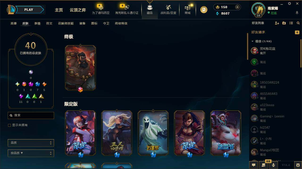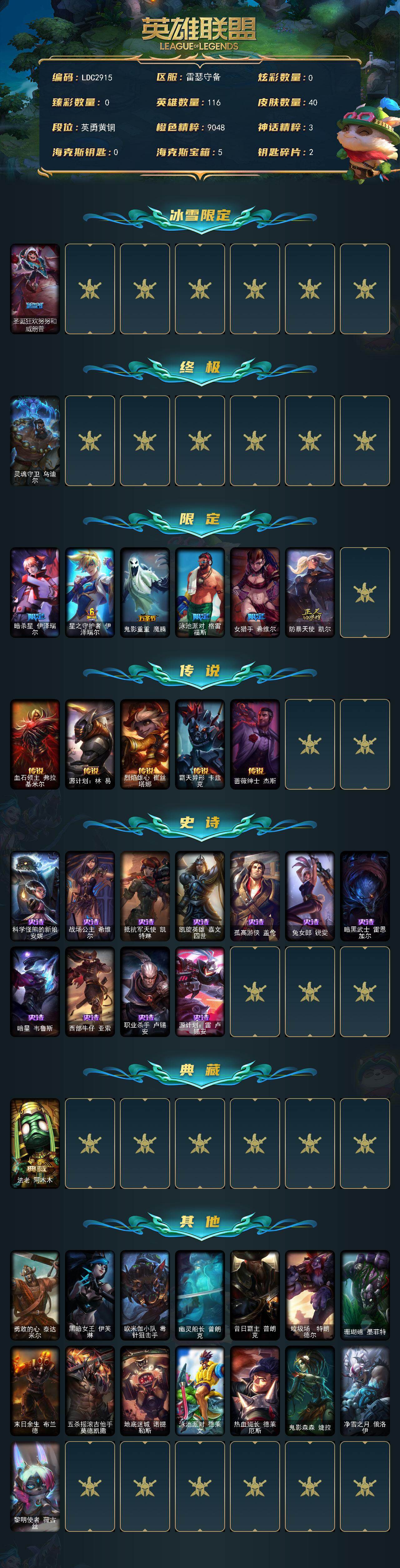 【C268093211】【LDC2915】116英雄/40皮肤/1终极/7限定/5传说/11史诗/青铜/圣诞狂欢努努和威朗普/灵魂守卫乌迪尔/暗杀星伊泽瑞尔/星之守护者伊泽瑞尔/鬼影重重魔腾/泳池派对格雷福斯/女猎手希维尔/防暴天使凯尔/血石领主弗拉基米尔/源计划林易/烈焰雄心崔丝塔娜/霸天异形卡兹克/蔷薇绅士杰斯/科学怪熊的新娘安妮/战场公主希维尔/抵抗军天使凯特琳/凯旋英雄嘉文四世/孤高游侠盖伦/兔女郎锐雯/暗黑武士雷恩加尔/暗星韦鲁斯/西部牛仔亚索/职业杀手卢锡安/源计划雷卢锡安/法老阿木木/勇敢的心泰达米尔/黑暗女王伊芙琳/欧米伽小队毒针狙击手/幽灵船长普朗克/昔日霸主普朗克/垃圾场特朗德尔/珊瑚礁墨菲特/末日余生布兰德/五杀摇滚吉他手莫德凯撒/地底迷城诺提勒斯/泳池派对德莱文/热血班长德莱厄斯/鬼影森森婕拉/净雪之月俄洛伊/黎明使者薇古丝