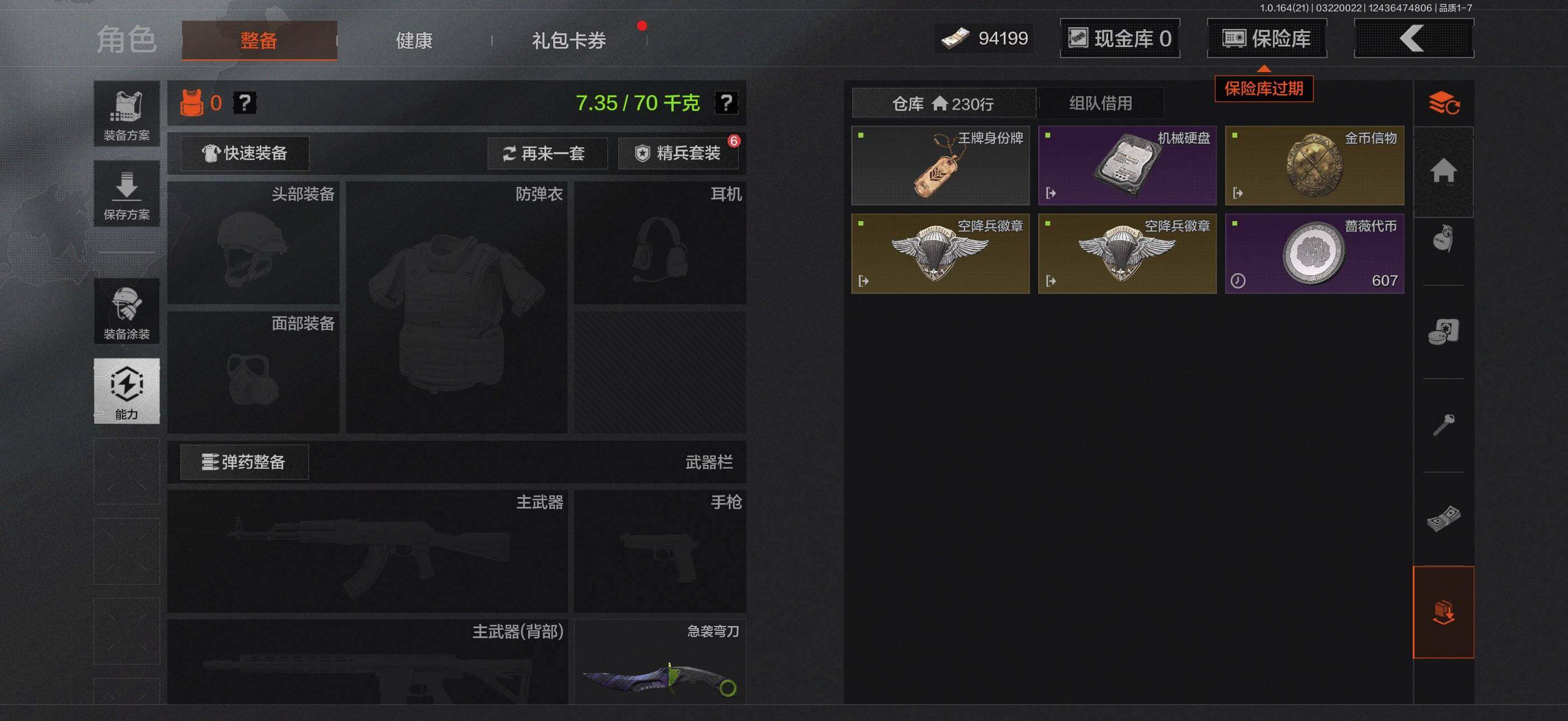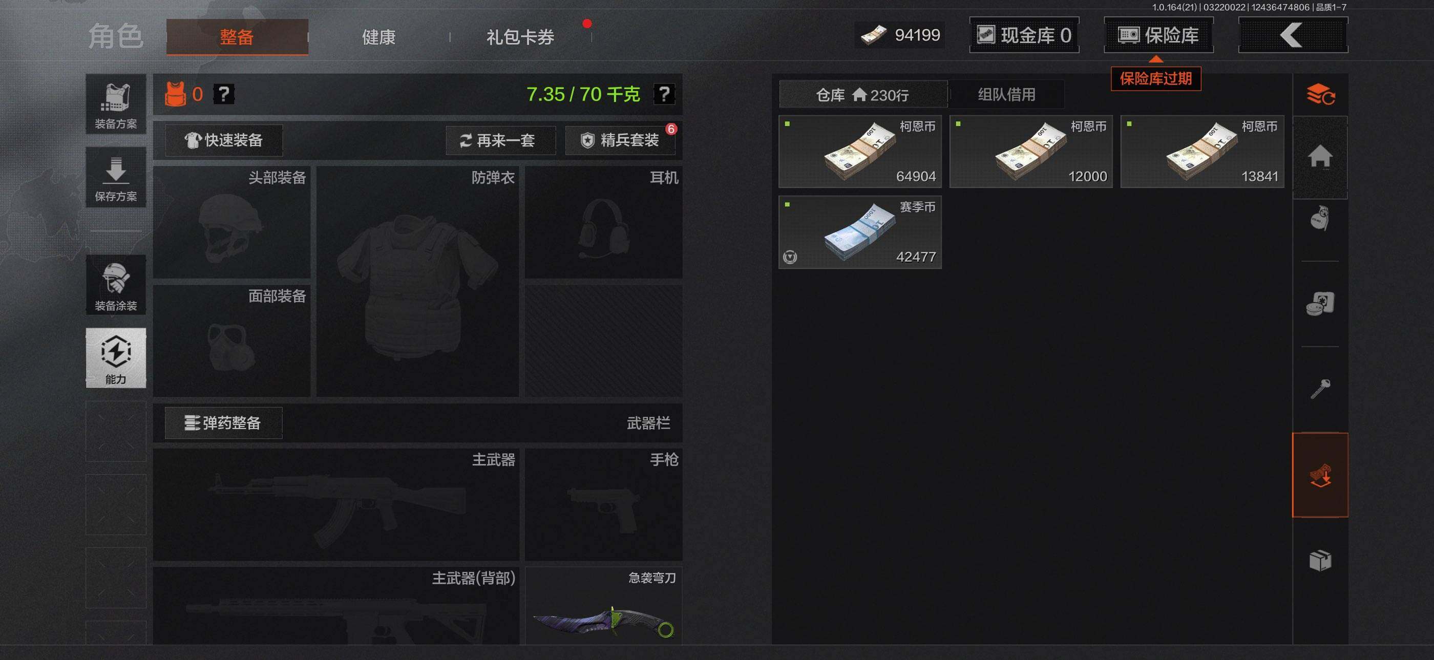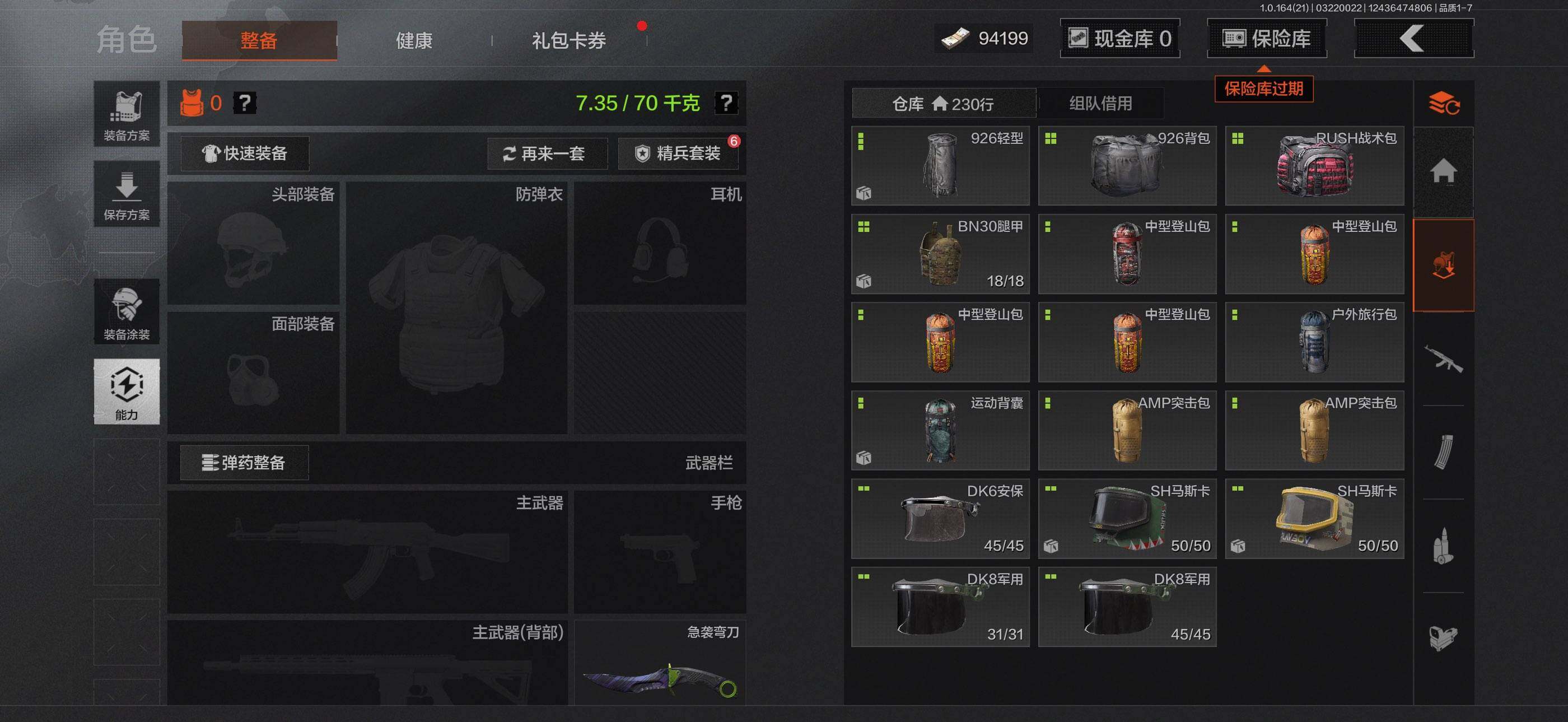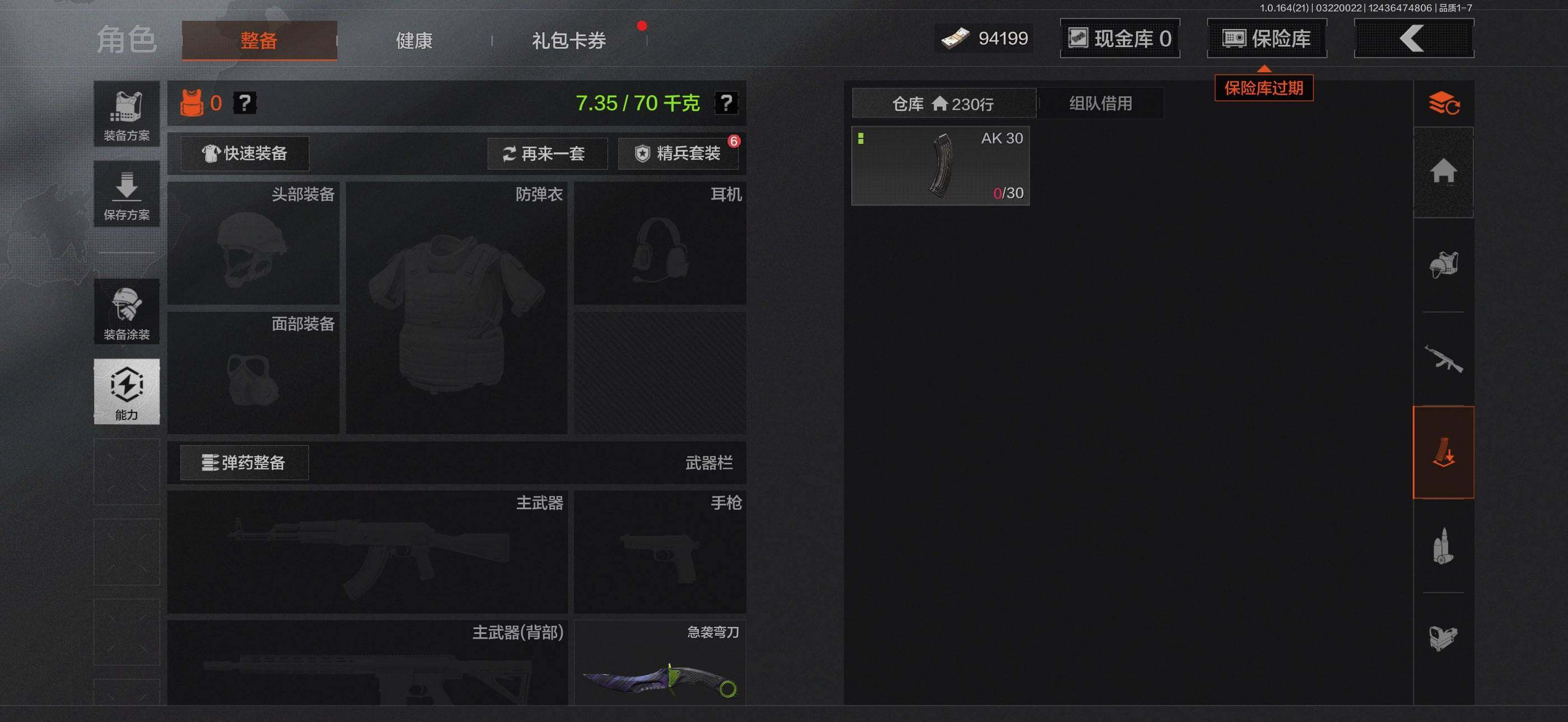 【C268055110】【AQQH899】等级:30/段位:暗区传说/仓库价值(百万):26.7/柯恩币:9075/急袭弯刀/赢家匕首/冥河/深潜行者II/近卫荣誉RPK16/赤帽要塞AR57/地脉深处FAL