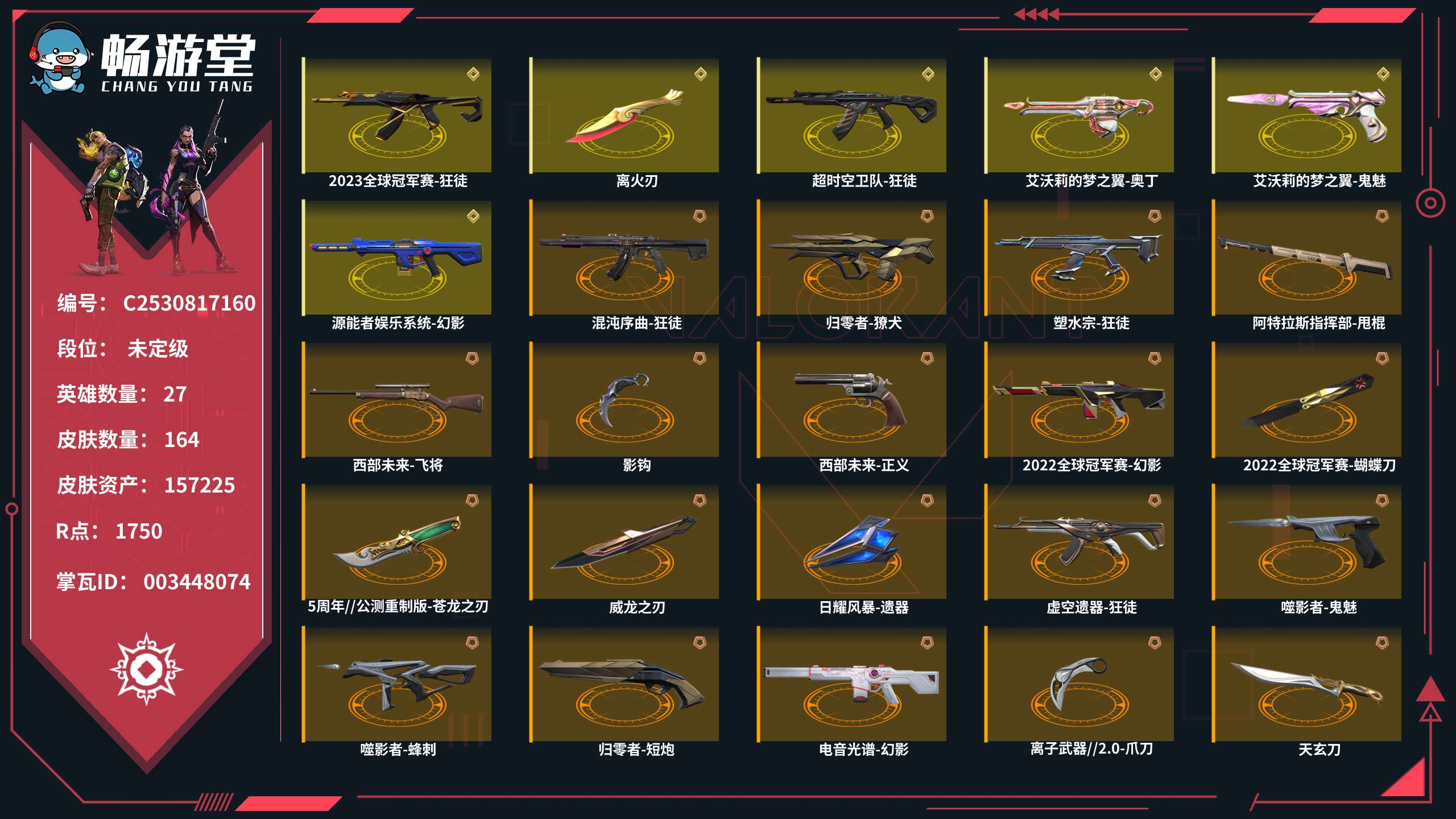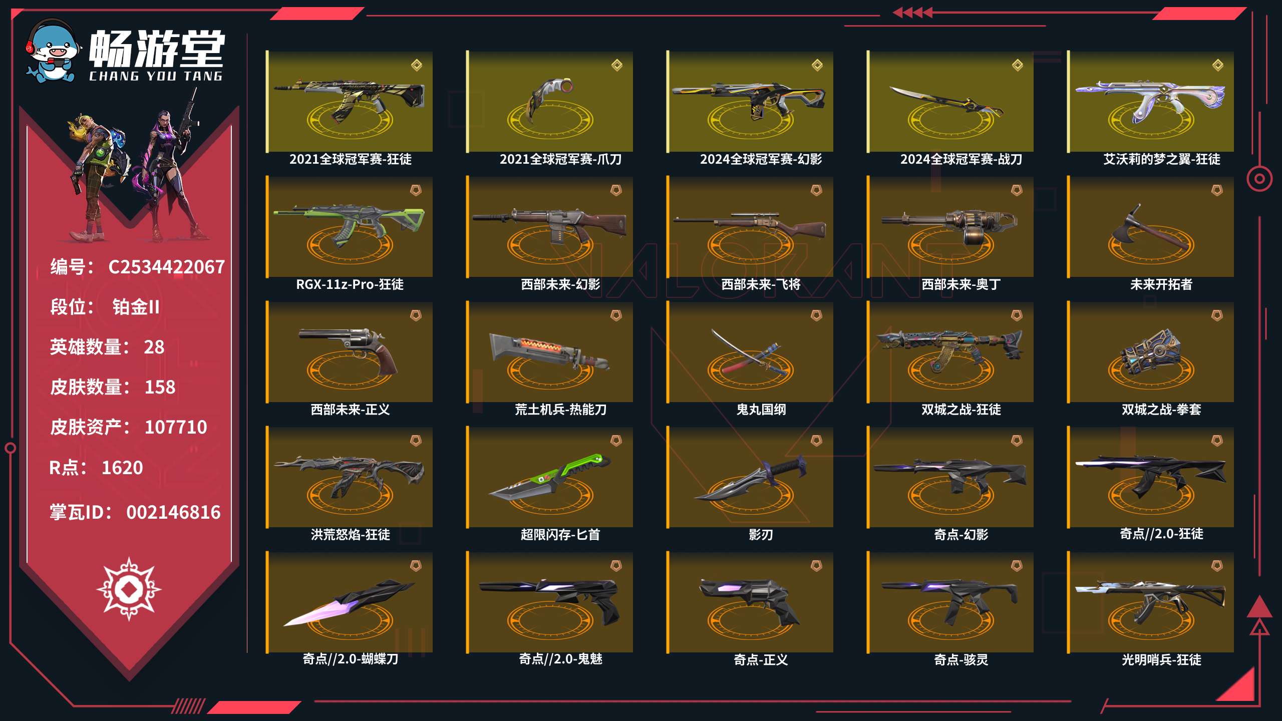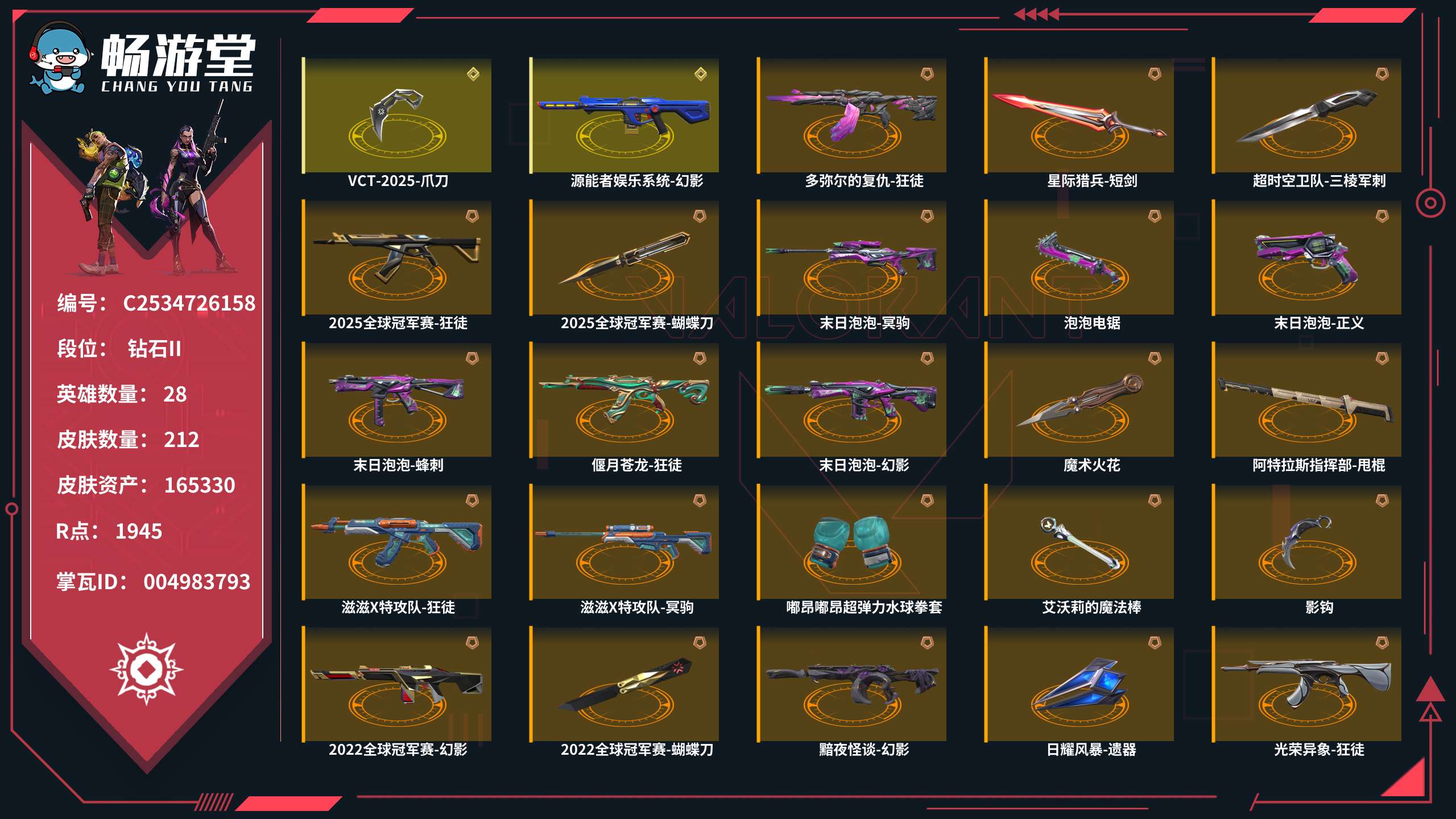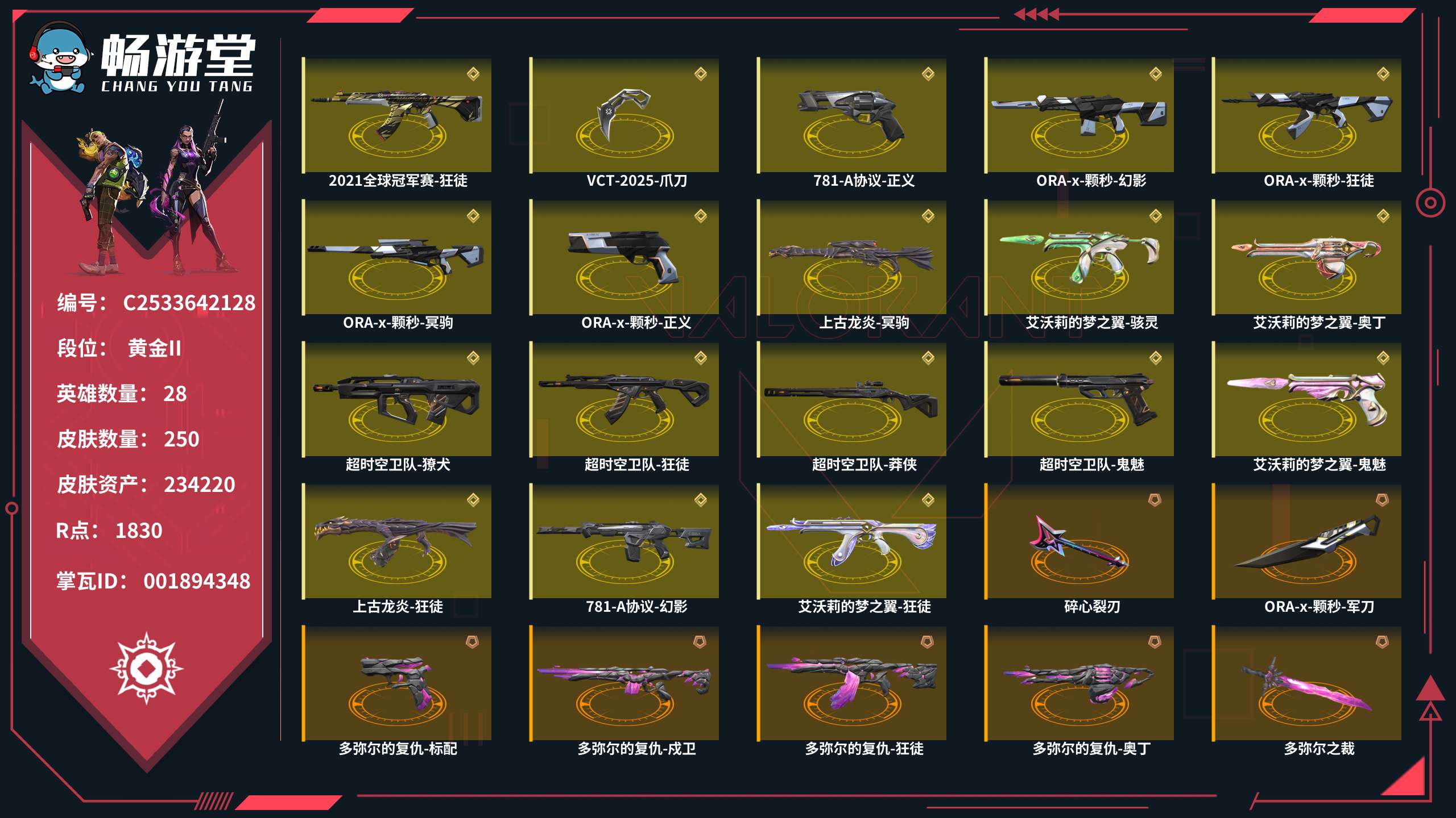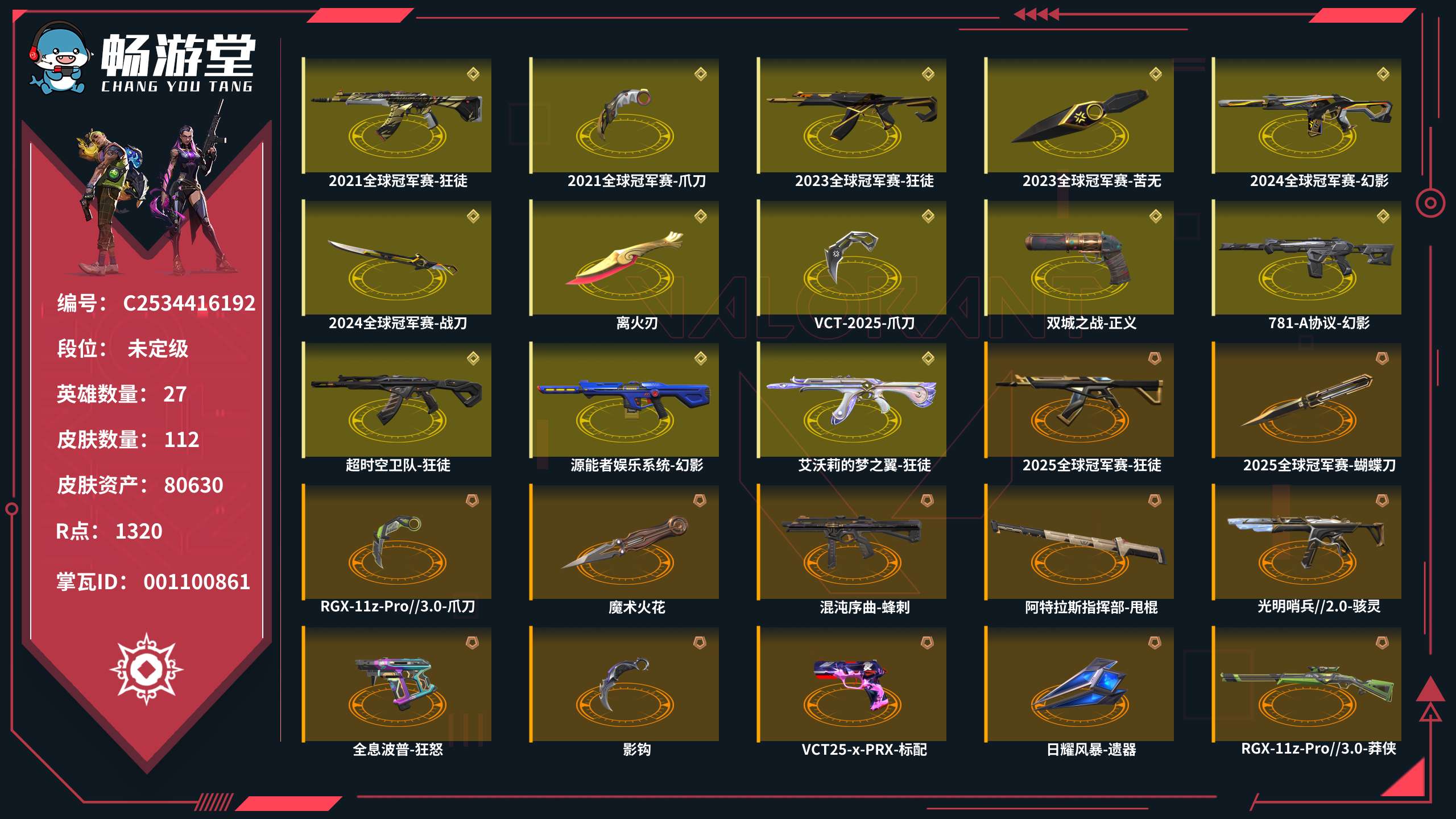 【C2532539897】皮肤资产:152805 皮肤数量:247 英雄数量:28 R点:2330 段位: 神话I 2021全球冠军赛-狂徒 2021全球冠军赛-爪刀 2023全球冠军赛-狂徒 2023全球冠军赛-苦无 2024全球冠军赛-幻影 2024全球冠军赛-战刀 离火刃 套装 【2025全球冠军赛 礼包(2025全球冠军赛-蝴蝶刀,2025全球冠军赛-狂徒)】 【2022全球冠军赛 礼包(2022全球冠军赛-蝴蝶刀,2022全球冠军赛-幻影)】 【5周年//公测重制版 礼包(5周年//公测重制版-苍龙之刃)】 【离子武器//2.0 礼包(离子武器//2.0-狂徒,离子武器//2.0-骇灵,离子武器//2.0-狂怒,离子武器//2.0-战神,离子武器//2.0-爪刀)】 【毁灭骑士 礼包(毁灭骑士-幻影,毁灭骑士-正义,毁灭骑士-奥丁,毁灭骑士-判官,毁灭战斧)】 【VCTxEDG 队伍礼包(VCT-x-EDG-标配)】 【2024全球冠军赛 礼包(2024全球冠军赛-幻影,2024全球冠军赛-战刀)】 【RGX 11z Pro//3.0(RGX-11z-Pro//3.0-莽侠,RGX-11z-Pro//3.0-正义,RGX-11z-Pro//3.0-爪刀)】 【源能者娱乐系统(源能者娱乐系统-幻影,源能者娱乐系统-冥驹,源能者娱乐系统-鬼魅,源能者娱乐系统-獠犬,街机高手)】 【千灵华绽(千灵华绽-幻影,千灵华绽-正义,千灵华绽-判官,千灵华绽-冥驹,落英飞旋)】 【2021全球冠军赛(2021全球冠军赛-狂徒,2021全球冠军赛-爪刀)】 【耀鳞威龙(耀鳞威龙-狂徒-,耀鳞威龙-鬼魅,威龙之刃)】 【机动狂飙(机动狂飙-战刀,机动狂飙-狂徒,机动狂飙-雄鹿,机动狂飙-蜂刺,机动狂飙-正义)】 【奇点(奇点-正义,奇点-骇灵,奇点-幻影,奇点-战神,奇点-军刀)】 【2023全球冠军赛(2023全球冠军赛-狂徒,2023全球冠军赛-苦无)】 【离火刃(离火刃)】 【无畏启程(超能冲撞-标配)】 狂徒【幻心猎手-狂徒,瑰梦艺语-狂徒,阿特拉斯指挥部-狂徒,光荣异象-狂徒,洪荒怒焰-狂徒,艾沃莉的梦之翼-狂徒,诡秘蛇影-狂徒,掠影-狂徒,奇点//2.0-狂徒,混沌序曲-狂徒,超能偶像-狂徒,塑水宗-狂徒,流星兵团-狂徒,海洋之星-狂徒,钢轨卫士-狂徒,沙尘幻旅-狂徒,弧光异彩-狂徒,盖亚的复仇-狂徒】幻影【甜心猎手-幻影,星际猎兵-幻影,悠闲猫生-幻影,日耀风暴-幻影,末日之翼-幻影,超限闪存-幻影,聚合之力-幻影,珍珠棘贝-幻影,战术小伙伴-幻影,砰砰X特攻队-幻影,侦察力量-幻影,噬源兽防卫工程-幻影,合金战车-幻影】近战武器【星际猎兵-短剑,阿特拉斯指挥部-甩棍,影刃,艾沃莉的魔法棒,日耀风暴-遗器,RGX-11z-Pro//2.0-蝴蝶刀,诡秘蛇影-军刀,超限闪存-匕首,超能偶像-应援棒,流星兵团-短剑,珍珠棘贝-短剑,钢轨卫士-战锤,沙尘幻旅-匕首,侦察力量-蝴蝶刀,弧光异彩-军刀,合金战车-军刀】正义【诛心猎手-正义,太空穿梭-正义,日耀风暴-正义,纳米打击-正义,超限闪存-正义,纤云弄巧-正义,复古浪潮-正义,沙尘幻旅-正义,合金战车-正义】冥驹【诛心猎手-冥驹,光环序列-冥驹,掠影-冥驹,甜蜜战术-冥驹,模拟赫兹-冥驹,复古浪潮-冥驹,胡桃狂想-冥驹,归零者-冥驹,花漾粉红-冥驹,无垠星环-冥驹】鬼魅【瑰梦艺语-鬼魅,甜蜜战术-鬼魅,诡秘蛇影-鬼魅,星云暗涌-鬼魅,模拟赫兹-鬼魅,采蜜小蜂队-鬼魅,流星兵团-鬼魅,灵魂消声者-鬼魅,光导纤维-鬼魅,胡桃狂想-鬼魅,信手涂鸦-鬼魅,数码咒术-鬼魅】骇灵【瑰梦艺语-骇灵,阿特拉斯指挥部-骇灵,日耀风暴-骇灵,浮光跃金-骇灵,流星兵团-骇灵,珍珠棘贝-骇灵,光导纤维-骇灵,沙尘幻旅-骇灵,信手涂鸦-骇灵,花漾粉红-骇灵】标配【星际猎兵-标配,阿特拉斯指挥部-标配,折光棱晶-标配,黯夜怪谈-标配,浮光跃金-标配,超能偶像-标配,VCT-x-BLG-标配,战术熊与伙伴们-标配,VCT-x-TLN-标配,光导纤维-标配,彩梦之城-标配】短炮【甜心猎手-短炮,悠闲猫生-短炮,末日之翼-短炮,混沌序曲-短炮,纤云弄巧-短炮,深海水族-短炮,钢轨卫士-短炮,弧光异彩-短炮】狂怒【光环序列-狂怒,幻语魔咒-狂怒,聚合之力-狂怒,战术熊与伙伴们-狂怒,珍珠棘贝-狂怒,钢轨卫士-狂怒,萌彩剪影-狂怒,花漾粉红-狂怒】蜂刺【甜心猎手-蜂刺,折光棱晶-蜂刺,超限闪存-蜂刺,聚合之力-蜂刺,纤云弄巧-蜂刺,深海水族-蜂刺,战术小伙伴-蜂刺,胡桃狂想-蜂刺,弧光异彩-蜂刺,合金战车-蜂刺】雄鹿【瑰梦艺语-雄鹿,幻语魔咒-雄鹿,模拟赫兹-雄鹿,复古浪潮-雄鹿,彩梦之城-雄鹿】判官【星际猎兵-判官,太空穿梭-判官,甜蜜战术-判官,偃月苍龙-判官,诡秘蛇影-判官,超能偶像-判官,采蜜小蜂队-判官,萌彩剪影-判官,数码咒术-判官】獠犬【诛心猎手-獠犬,悠闲猫生-獠犬,幻语魔咒-獠犬,模拟赫兹-獠犬,采蜜小蜂队-獠犬,复古浪潮-獠犬,781-A协议-獠犬,战术小伙伴-獠犬,胡桃狂想-獠犬,弧光异彩-獠犬,数码咒术-獠犬】戍卫【甜心猎手-戍卫,光环序列-戍卫,太空穿梭-戍卫,甜蜜战术-戍卫,折光棱晶-戍卫,浮光跃金-戍卫,超能偶像-戍卫,战术熊与伙伴们-戍卫,珍珠棘贝-戍卫,破败军械-戍卫,钢轨卫士-戍卫,萌彩剪影-戍卫,彩梦之城-戍卫,花漾粉红-戍卫】飞将【星际猎兵-飞将,悠闲猫生-飞将,幻语魔咒-飞将,天界神兵-飞将,末日之翼-飞将,聚合之力-飞将,战术熊与伙伴们-飞将,盖亚的复仇-飞将,光导纤维-飞将,沙尘幻旅-飞将,信手涂鸦-飞将,合金战车-飞将】战神【光环序列-战神,太空穿梭-战神,浮光跃金-战神,采蜜小蜂队-战神,深海水族-战神,萌彩剪影-战神,数码咒术-战神】奥丁【诛心猎手-奥丁,日耀风暴-奥丁,末日之翼-奥丁,流星兵团-奥丁,天界神兵//2.0-奥丁,战术小伙伴-奥丁,信手涂鸦-奥丁,炫彩澎湃-奥丁】莽侠【甜心猎手-莽侠,阿特拉斯指挥部