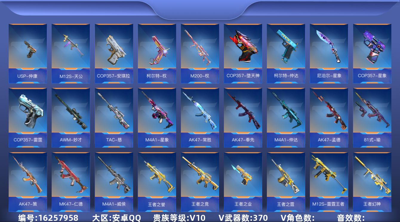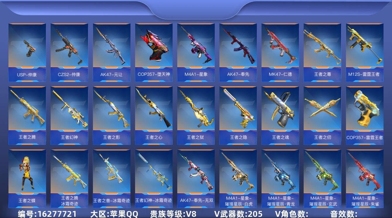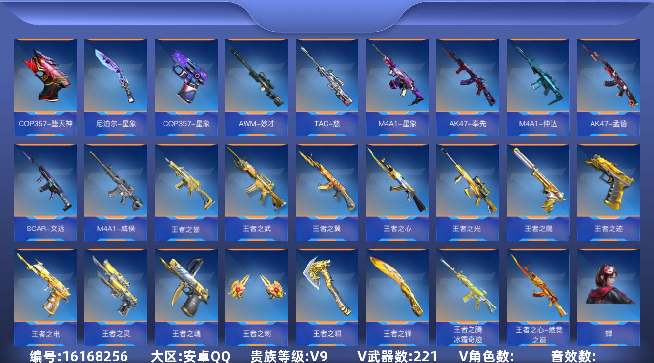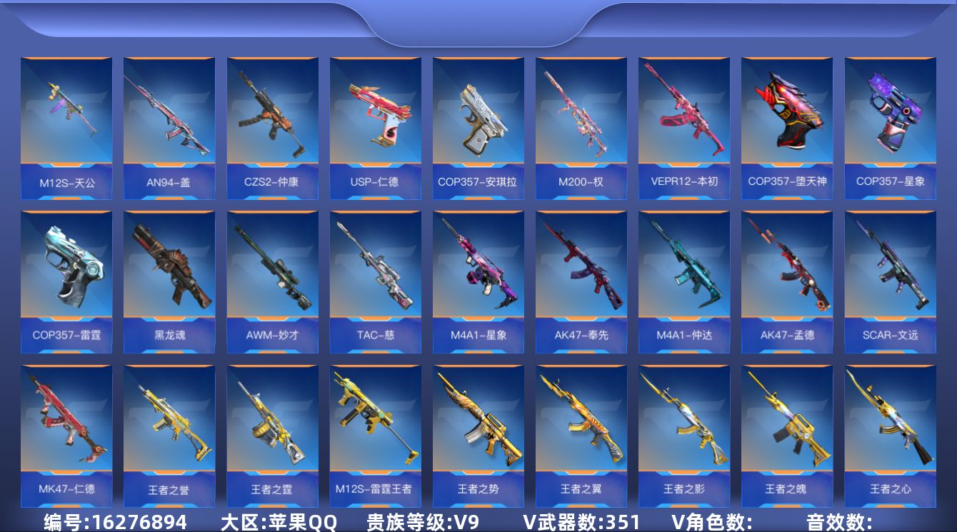 【C2523908722】【系统】苹果QQ 【游戏等级】151 【贵族等级】V9 【收藏点数】29163 【武器】武器-王者之腾-冰霜奇迹 武器-王者之魄-HeartShot 武器-王者之心-燃竞之巅 武器-王者之魄-白金血钻 武器-王者之翎-冰霜奇迹 武器-王者之怒-HeartShot 武器-王者之掣 武器-王者之狱-冰霜奇迹 武器-王者之心 武器-王者之影 武器-王者之兽 武器-王者之神 武器-M12S-雷霆王者 武器-王者之霆 武器-王者之隐-冰霜奇迹 武器-王者之魂-HeartShot 武器-王者之迹 武器-王者之锋-白金血钻 武器-王者之锋 武器-王者之击 武器-王者之痕 武器-王者之势手雷*2 武器-王者之势闪光弹-HeartShot*2 武器-王者之势烟雾弹 武器-王者之势烟雾弹-HeartShot 武器-王者之兽手雷*2 武器-王者之兽闪光弹*2 武器-王者之兽烟雾弹*2 武器-王者之心手雷-HeartShot 武器-王者之心闪光弹-HeartShot*2 武器-王者之心烟雾弹-HeartShot 武器-王者之心手雷 武器-王者之心烟雾弹 武器-王者之翼闪光弹 武器-王者之圣闪光弹 武器-王者之翼烟雾弹 武器-王者之圣烟雾弹 武器-AK47-孟德 武器-AK47-奉先-无双 武器-M4A1-星象 武器-M4A1-仲达 武器-AN94-盖*2 武器-MK47-仁德-羸魔 武器-AWM-妙才 武器-CZS2-仲康 武器-AK47-波塞冬 武器-M4A1-游骑兵-寒霜 武器-M200-幻神 武器-P90-双脊龙 武器-VEPR12-宙斯 武器-81式-光明之神-三足金乌 武器-COP357-堕天神*7 武器-柯尔特-仲达 武器-CZ75-策 武器-MK23-幻神 武器-炽芒蝶刃 武器-手雷-宙斯 武器-闪光弹-宙斯 武器-烟雾弹-宙斯 武器-王者之仞-冰霜奇迹 武器-屠龙-锈迹斑斑 武器-尼泊尔-火麒麟-钰 武器-黑骑士燃烧弹-能量核心*3 武器-USP-仁德 武器-双持沙鹰-元让 武器-蟒蛇-奉先 武器-双持GLOCK18-本初 武器-雌雄双股剑 武器-虎贲钩镰刀 武器-气勇胆烈戟 武器-穷奇铁扇 武器-方天画戟 武器-激昂霸王枪 武器-思召剑 武器-啖睛矢 武器-AK47-无影-暗月 武器-AK47-火麒麟-雷掣战翼 武器-AK47-黑武士觉醒-诸神黄昏 武器-AK47-沙漠领主 武器-AK47-星速-纸片 武器-AK47-Rush-星速 武器-AK47-樱斗士-一觉 武器-AK47-机械迷城 武器-AK47-幸运日觉醒 武器-AK47-猩红传说 武器-AK47-沙漠郡主-超觉 武器-AK47-燎天净火 武器-AK47-雷麒麟-火锅 武器-AK47-血武士-甲骨文渊 武器-AK47-黑鲨 武器-AK47-风神翼龙 武器-AK47-谜城烟火 武器-M4A1-雷神-千变 武器-M4A1-黑骑士-白马银枪 武器-M4A1-黑龙-墨子 武器-M4A1-死神-马赛克 武器-M4A1-死神 武器-M4A1-死神-机甲核心 武器-M4A1-死神-能量核心 武器-M4A1-竞技战魂-瑞财 武器-M4A1-Rush-夜袭 武器-M4A1-变色龙 武器-M4A1-竞界荣光 武器-M4A1-赛博雷神 武器-M4A1-雷霆 武器-M4A1-海骑士*2 武器-M4A1-冰锋觉醒 武器-M4A1-哈迪斯 武器-M4A1-破空冰刃 武器-M4A1-堕天神 武器-M4A1-运输船 武器-M4A1-游骑兵-香香 武器-M4A1-猎神 武器-M4A1-夏清 武器-M4A1-千变 武器-M4A1-太白诗仙 武器-M4A1-铁胆虎魄 武器-SCAR-幽暗骑士*2 武器-SCARLight-白虎 武器-SCAR-探星者-星海邀游 武器-SCAR-心动PICK 武器-剑齿虎 武器-AN94-超新星*2 武器-剑齿虎-炫彩 武器-AN94-四凶觉醒 武器-AN94-赳赳秦师 武器-XMB-湮灭 武器-AUG-机械纪元 武器-9A91-天神 武器-M14EBR-天神 武器-M14EBR-拂影 武器-M14EBR-葫芦山庄 武器-M16-恶魔 武器-QBZ03-金色蔷薇*2 武器-QBZ03-死神 武器-QBZ03-玉面羞花 武器-QBZ03-天罚 武器-HK416-极光 武器-HK417-炎龙铠甲 武器-MK47-鼓龙-白昼 武器-G3A3-衍神兵 武器-QBZ97-浩瀚征途 武器-QBZ191-金甲虎啸觉醒 武器-QBZ191-封神榜 武器-AWM-天龙-秘银 武器-AWM-赛博时代 武器-AWM-天龙-曼陀罗 武器-AWM-裁决 武器-AWM-天使 武器-AWM-指南针觉醒 武器-巴雷特-毁灭*2 武器-巴雷特-毁灭-星空*2 武器-巴雷特-毁灭-RGB骇客 武器-巴雷特-毁灭-暗月 武器-巴雷特-极光*4 武器-巴雷特-极光-清凉夏日*2 武器-巴雷特-极光-尼尔 武器-巴雷特-安琪拉 武器-巴雷特-雷霆 武器-巴雷特-冬灭觉醒 武器-M200-心动次元觉醒 武器-09式狙-天神 武器-VSK-94-九黎兵主觉醒 武器-加特林-堡垒 武器-加特林-堡垒觉醒 武器-加特林-蟒蛇 武器-刘易斯-血月 武器-MK5-机械纪元 武器-MK5-极光*2 武器-汤姆逊-烈龙 武器-寒霜烈龙*2 武器-双持斯泰尔-天使 武器-QCW05-变形金刚·大黄蜂 武器-A180-地狱凤凰 武器-CBJ-MS-毒蜂*2 武器-CZS2-血月 武器-M12S-雷霆 武器-PP19野牛-造纸术 武器-DDM4-POW-星际宇航觉醒 武器-打击者-天神 武器-地狱火 武器-嗜血金鲨 武器-地狱烈炎 武器-地狱烈樱·二觉 武器-AA12-竞界荣光 武器-AA12-火药觉醒 武器-KSG-火力竞放 武器-KSG-天使 武器-KSG-极光 武器-M1887-幽冥玄喵觉醒 武器-M1216-血月 武器-USP-神罚*6 武器-USP-机械迷城*2 武器-USP-太白诗仙 武器-沙鹰-修罗 武器-沙鹰-火麒麟-钰 武器-沙鹰-火麒麟*2 武器-沙鹰-无影 武器-沙鹰-竞技战魂*2 武器-沙鹰-修罗-铁骑*2 武器-气手枪-血月 武器-沙鹰-神兵修罗*3 武器-沙鹰-宇航兔兔 武器-烈焰弓 武器-蟒蛇-鼓龙 武器-左轮-卧龙觉醒 武器-GLOCK18-宙斯 武器-GLOCK18-猎神 武器-QSZ92-天使 武器-QSZ92-冰魂觉醒 武器-MAC-10-风神翼龙 武器-掠夺者P365-虹舞 武器-墨刃-幻神 武器-蝴蝶刀-天神 武器-清刚-觉醒 武器-匕首-浩瀚征途 武器-匕首-冰魂觉醒 武器-战斧-无影-不屈老兵 武器-血阳 武器-龙啸-堕天神 武器-手斧-机械迷城 武器-秋逸觉醒 武器-屠龙*2 武器-屠龙-星空*2 武器-血月*2 武器-尼泊尔-雷霆*7 武器-尼泊尔-冰锋觉醒 武器-龙鳞-觉醒 武器-太白诗仙扇 武器-麒麟刺-星空 武器-麒麟刺 武器-星芒*2 武器-麒麟刺-堕天神 武