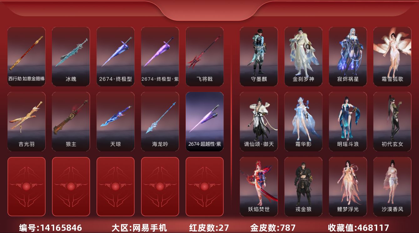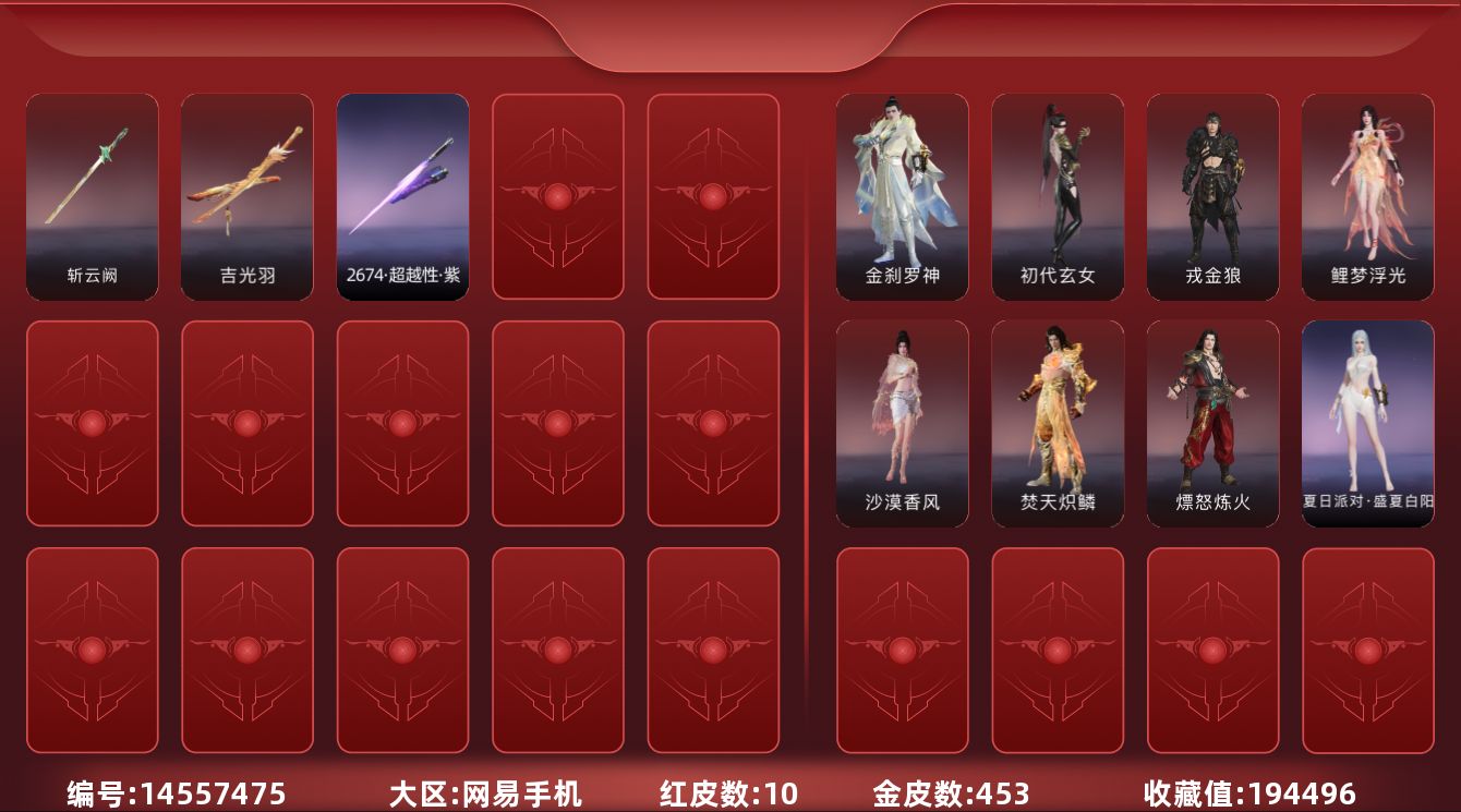 【C2534871617】[14557475]WJ3364,网易手机手游,1月5日可换绑,四人段位辉月2,10红,453金,2674超越型紫,吉光羽,斩云阙,沙漠香风,金刹罗神,熛怒炼火,焚天炽鳞,初代玄女,戎金狼,鲤梦浮光,至纯,盛夏白阳,赤影妖刀姬,残阳镀,九霄寒,嘉果花,莲心剑雨,琉璃尊者,杨戬,雪魅星尘,掌珠仙子,悠竹萌客,找回包赔