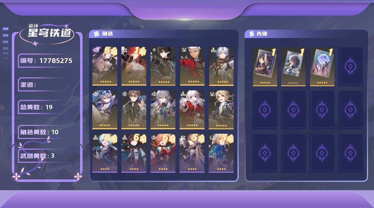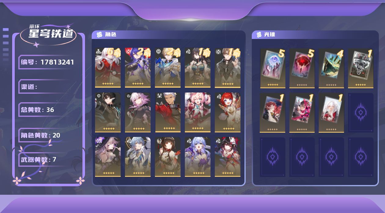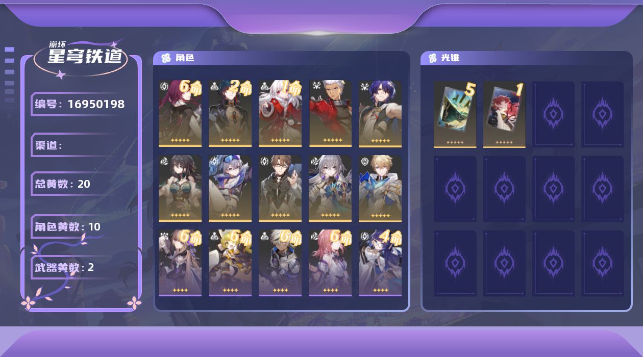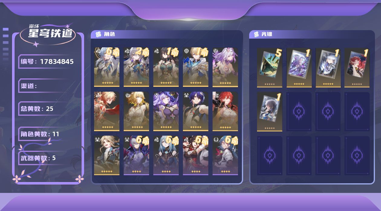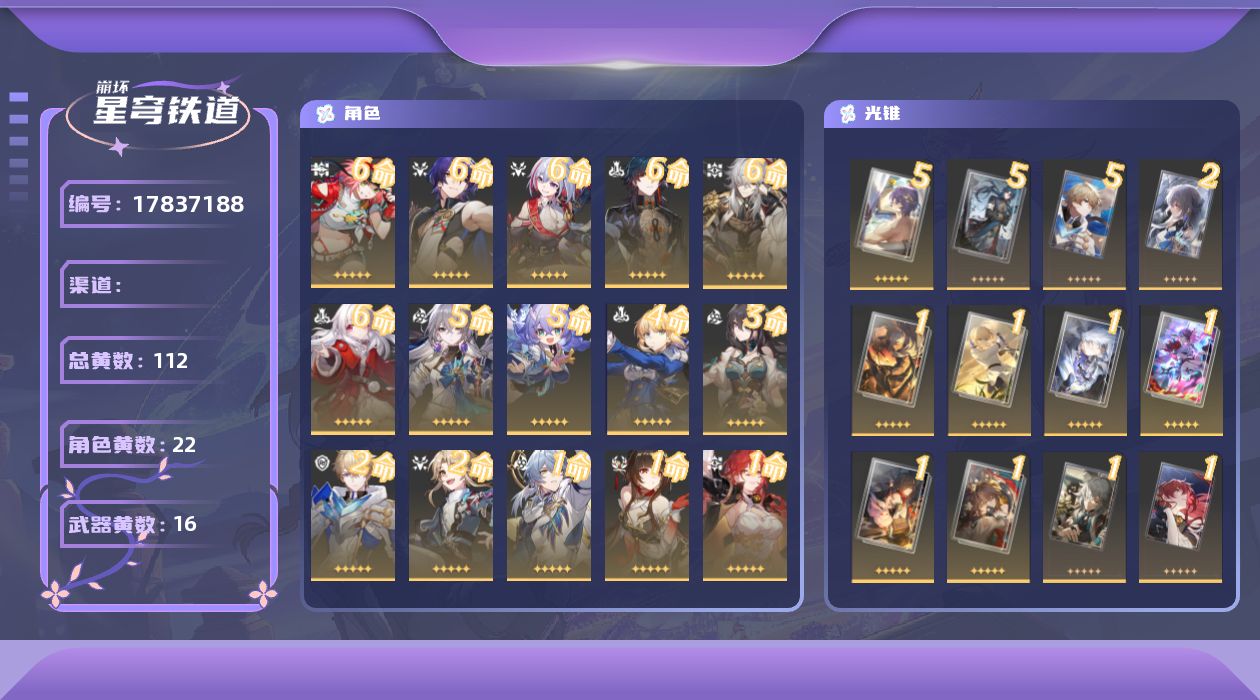 【5星角色12个】0命遐蝶,0命黄泉,0命翡翠,0命知更鸟,0命真理医生,0命阮•梅,0命藿藿,0命姬子,0命杰帕德,0命克拉拉,0命银狼,0命Archer,